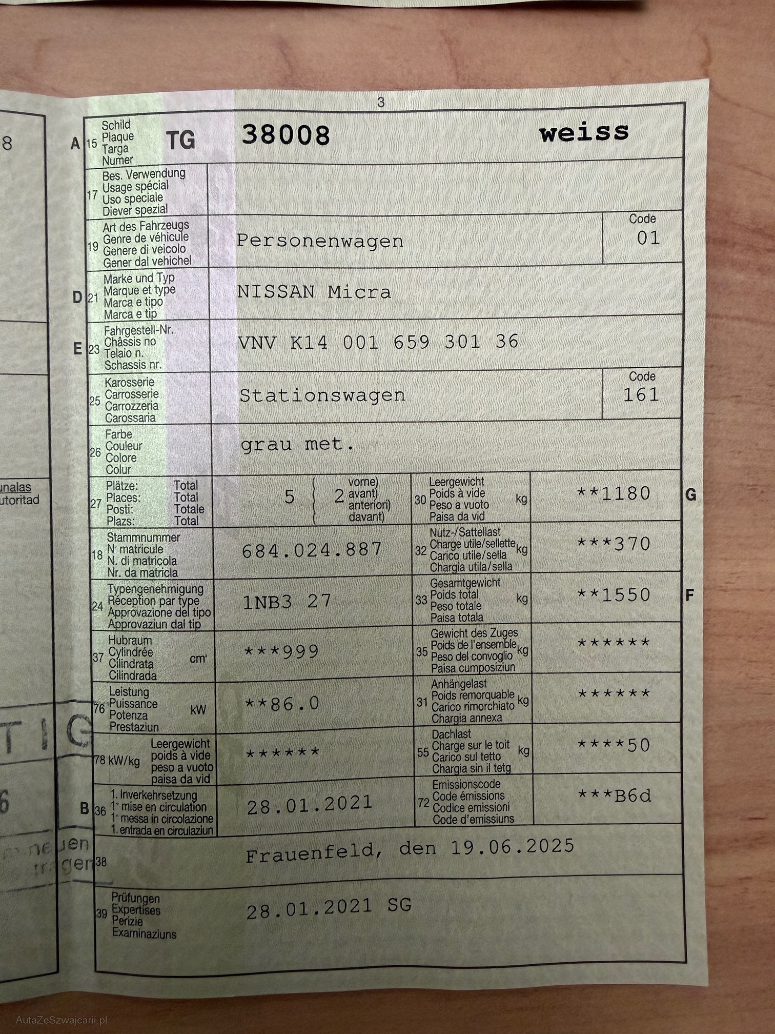 | Kommentar | Gebrauchtes Fahrzeug kann diverse Kratzer und Beulen aufweisen. Fahrzeugbereifung und Ausstattung gemäss Foto. Keine mechanische Prüfung, Fahrzeugkauf auf eigenes Risiko ab Platz ohne Nachwährschaft. Die Gewährleistung für Sachmängel wird wegbedungen. Keine Barzahlung möglich, Sie erhalten von uns nach Zusage eine Rechnung, muss innert 3 Tagen bezahlt und abgeholt werden. |