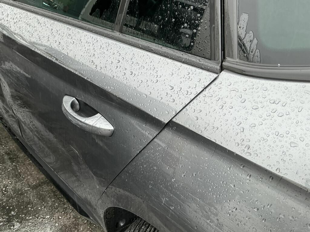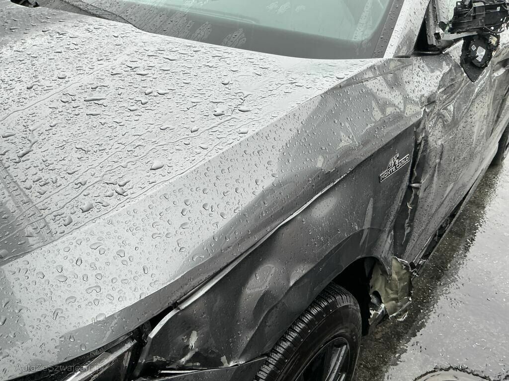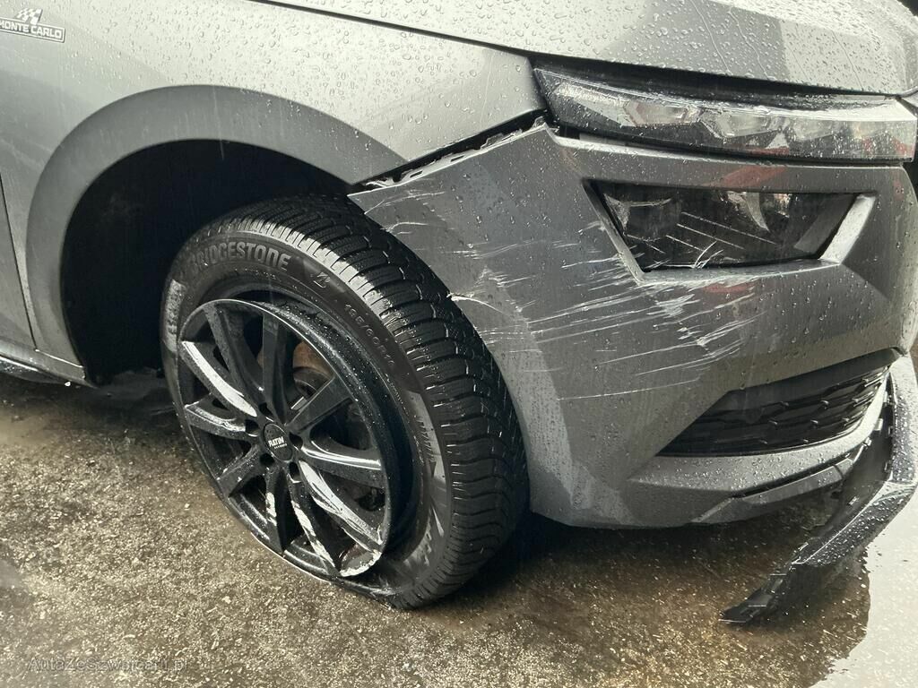 Jante avant droite cassée, pneu percé et suspension faussée, phares avant gauche et droit, pare-chocs avant, rétroviseur gauche, cache bas de caisse gauche, poignée de porte avant gauche cassés. Capot, ailes avant et arrière gauche, porte avant et arrière gauche, montant de pare-brise gauche et bas de caisse gauche enfoncés. Divers témoins allumés.