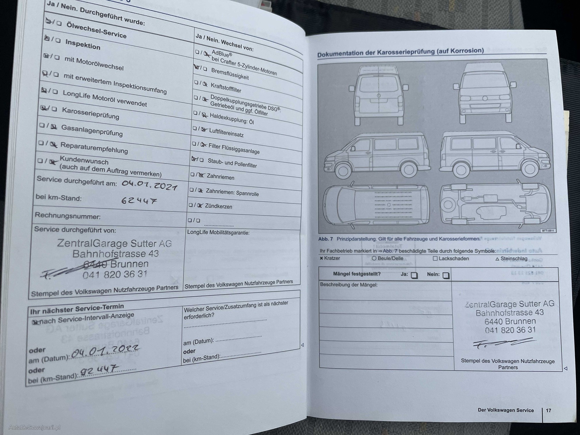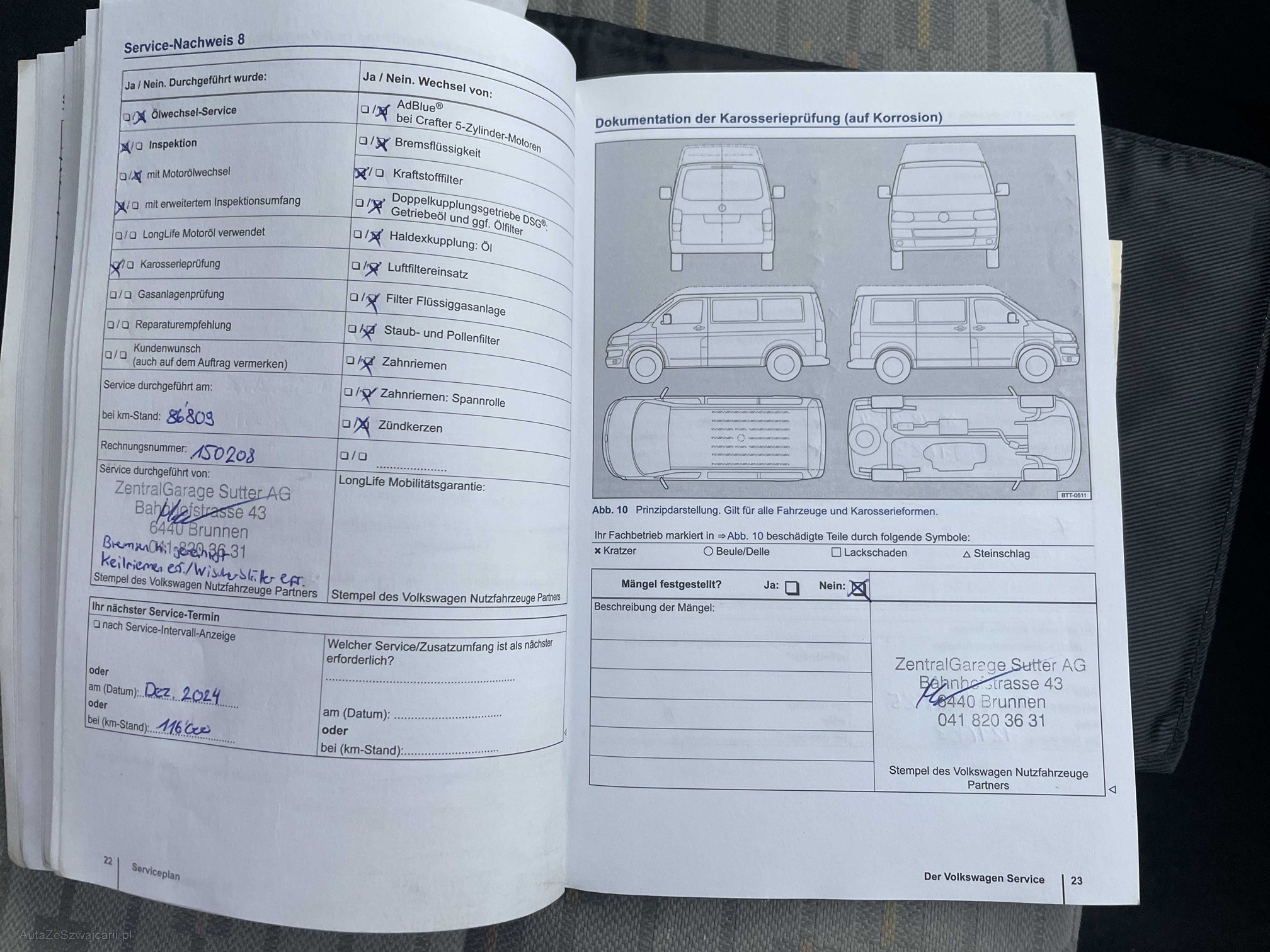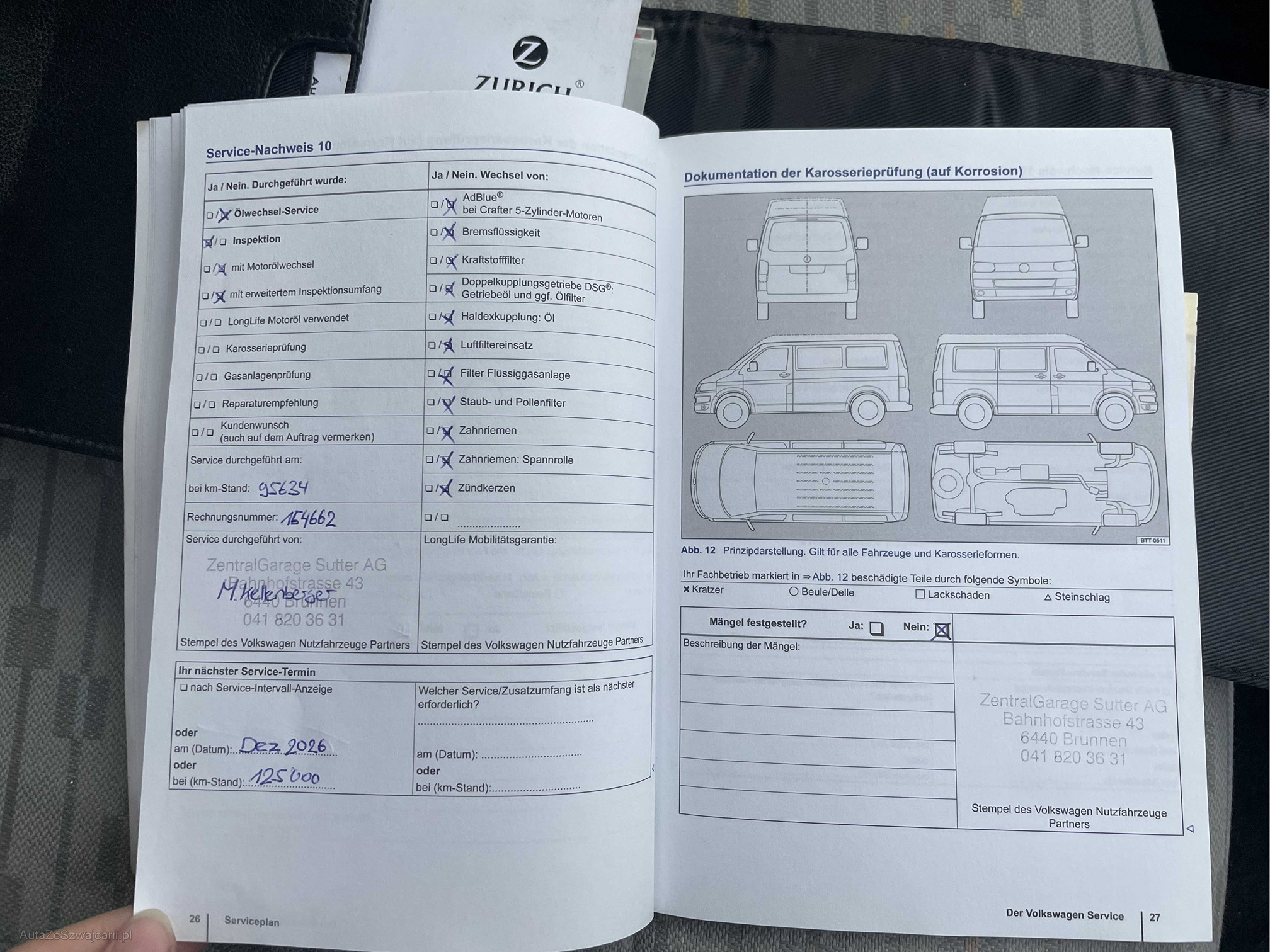 | Kommentar | Loch im Stossfänger hinten links Zustand Bremsen vorne und hinten ca. 50% Profiltiefe Winterbereifung: Vorne: 6mm, hinten: 5.5mm Zustand innen: Siehe Fotos Zustand aussen: siehe Fotos ------Diese Auflistung ist ohne Gewähr auf Vollständigkeit------------- |