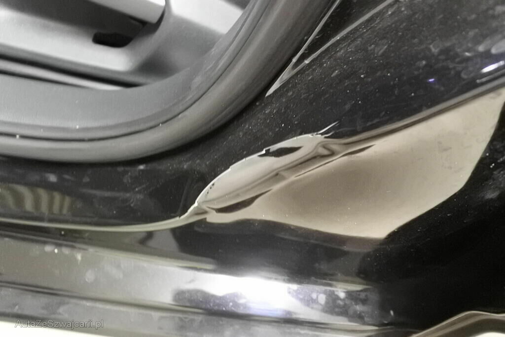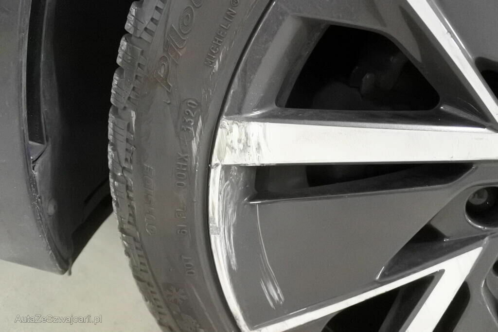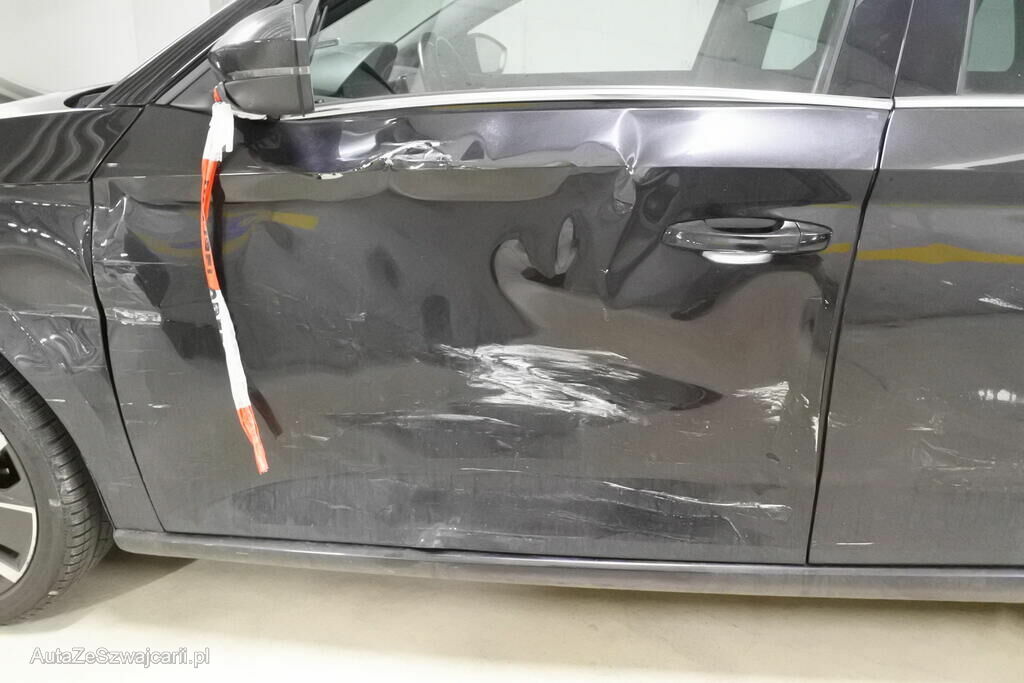 Der Kotflügel mit Auskleidung, die Felge sowie die Radaufhängung und beide Türen mit Anbauteilen sind beschädigt. Die B-Seule und der Schweller links sind deformiert.