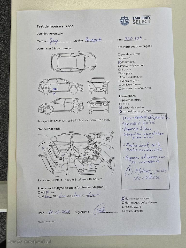 | Information | 1 clé Map et carnet de service disponible Service à faire Expertise à faire Equipé en roues d'hiver pneus 6 mm Freins avant 40 % Friens arrière 60 % Rayures et bosses sur la carrosserie Défaut moteur : joint de culasse à chager |