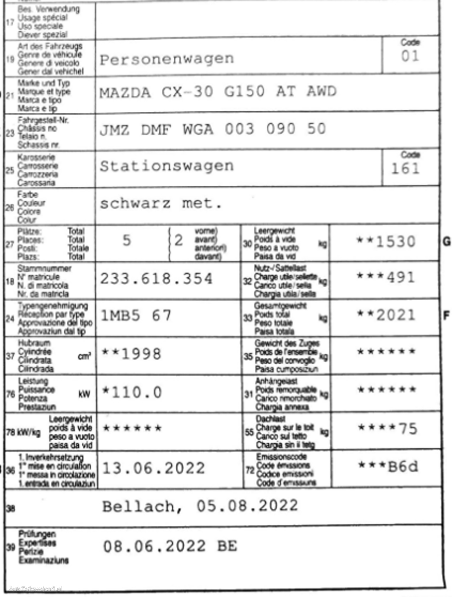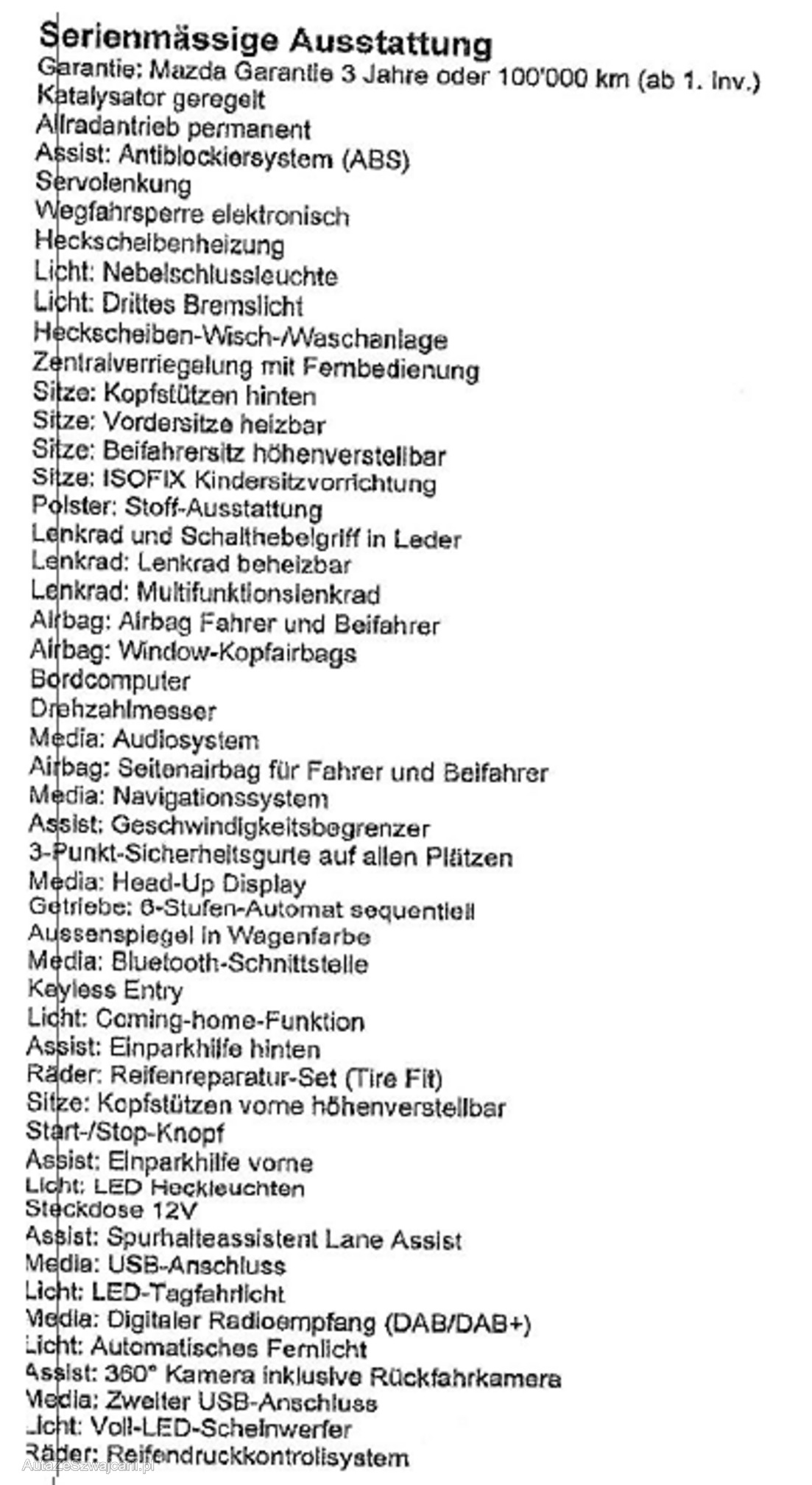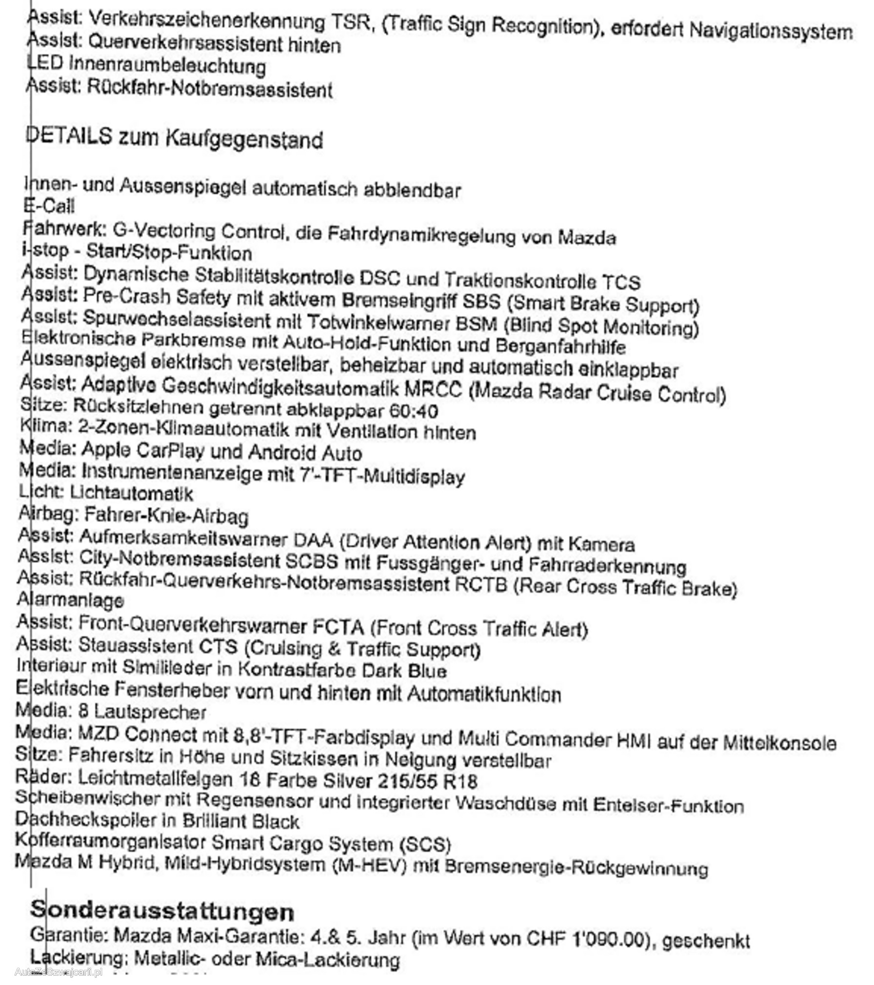 | Kommentar | Mazda CX-30 Ambition Plus mit 4x4 und sehr guter Ausstattung Navigation, 360° Kamera inkl. Rückfahrkamera, Keyless, Head-Up Display, Einparkhilfe vorne und hinten, LED, Lane Assist, Blind Spot Monitoring uvm. (siehe Fotos Liste) Der Wagen hat einen Hagelschaden, Schadennummer vorhanden (kann über Zurich Versicherung abgerechnet werden) Zu machen wäre: Gründliche Innenreinigung (etwas Tierhaare im Fahrzeug) Einstieg VR ausbessern Felge VR lackieren Gebrauchsspuren Lenkrad Keine Hutablage vorhanden ab Platz mit Sommer (V4 H5) und Winterreifen (V4 H4.5m) |