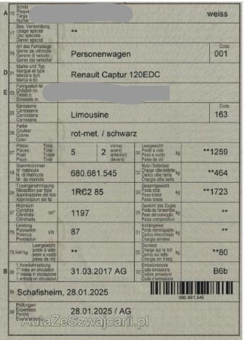 | Condition_and_Equipment | Zustand Fahrzeug ist rollbar. Motor startet nicht, Ursache unbekannt. Schlüssel Beide Schlüssel vorhanden. --- Front Front eingedrückt. Kotflügel vorne rechts und links eingedrückt. Motorhaube eingedrückt. Frontblech/Maskenblech eingedrückt. Radhaus vorne rechts und links eingedrückt. Längsträger vorne rechts und links gestaucht. Motor Risiko Motor. Motoranbauteile beschädigt. Alle Kühler vorne sind eingedrückt. Elektrik Kabelstränge verbrannt, beschädigt, abgerissen. Innenraum Beide Airbags sind ausgelöst. Gurtstraffer vorne ausgelöst. Glas Windschutzscheibe ist gerissen. Weitere Beschädigungen Scheinwerfer links und rechts, Stossfänger vorne --- Serienaustattung Airbag Fahrer und Beifahrerseite Sitzheizung vorne Elektrische Fensterheber vorne Aussenspiegel elektrisch verstellbar und heizbar Lederlenkrad Elektrische Fensterheber hinten ABS und EBV Elektr. Bremskraftverteilung Reifendruck-Kontrollsystem RDK Deaktivierung Beifahrerairbag Pack Colour Isofix-Kindersitzbefestigung Ledersitze Not-Bremsassistent mit Aktivierung der Warnblinkanlage Seitenairbags vorne ESP/ ASR/ CSV Tempomat mit Geschwindigkeitsbegrenzer Ersatzrad Dunkle Verglasung hinten Elektrische variable Servolenkung Keyless-Drive Hands-free Höhenverstellbarer Fahrersitz HSA Berganfahrassistent Rücksitzlehne geteilt 1/3 oder 2/3 / umklappbar Klimaanlage automatisch inkl. Pollenfilter Licht- und Regensensor Nebelscheinwerfer mit Corner Funktion Einparkhilfe hinten Stop + Start System LED Tagfahrlicht Aussenspiegel elektrisch einklappbar Leichtmetallfelgen 17" schwarz Dach in Kontrastfarbe Keine Gewähr auf die Angaben der Serienausstattungen DAB+ Digital Audio Broadcast R-Link Einparkhilfe hinten mit Rückfahrkamera Pack Sitze Pack Premium Sonderausstattung Armlehnen vorne Premium Fussmatten Lackierung Sonderfarben zweifarbig |