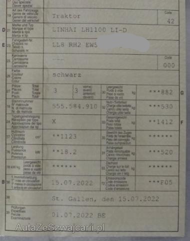 | Condition_and_Equipment | Zustand Fahrzeug ist fahrbar. Sonstiges Fahrzeugdokumente vorhanden. Traktor Allrad Zugelassene Geschwindigkeit >30 km/h --- Links Linke Seite beschädigt. Dach Dach eingedrückt. Sonstige Schäden Div.Carrosserie Teile sind leicht beschädigt. --- Ausstattung Gefederte Vorderachse |