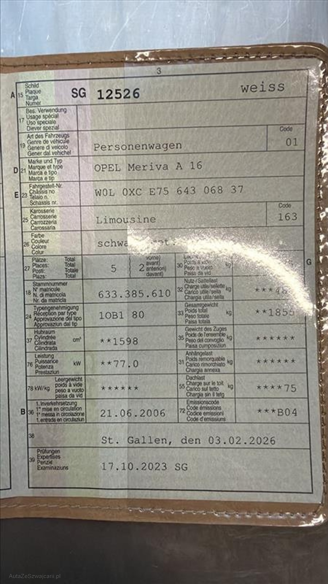 | Kommentar | Fahrzeug wird infolge Todesfall verkauft. Auto ist mechanisch in sehr gutem Zustand (Auspuffanlage praktisch neuwertig, Vorderachsrahmen i.O. keine Durchrostungen), da ältere Person das Auto gefahren hat sind diverse Kratzer und Dellen vorhanden, Profil Sommer- (6mm) und Winterreifen (7.3mm) i.O. Brems- und Stossdämpferprüfstand i.O., Bremsen tip top, Service müsste gemacht werden. Fahrzeug kann ohne grossen Aufwand MFK bereit gestellt werden. Kupplung i.O. fährt einwandfrei |