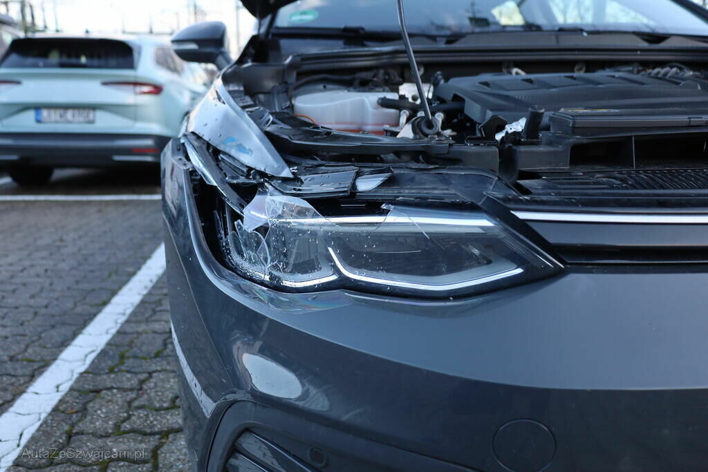 Anprall an die rechte Fahrzeugfront mit Deformation von Stossfänger, Scheinwerfer, Motorhaube, Kotflügel, Strebe sowie Halterungen.