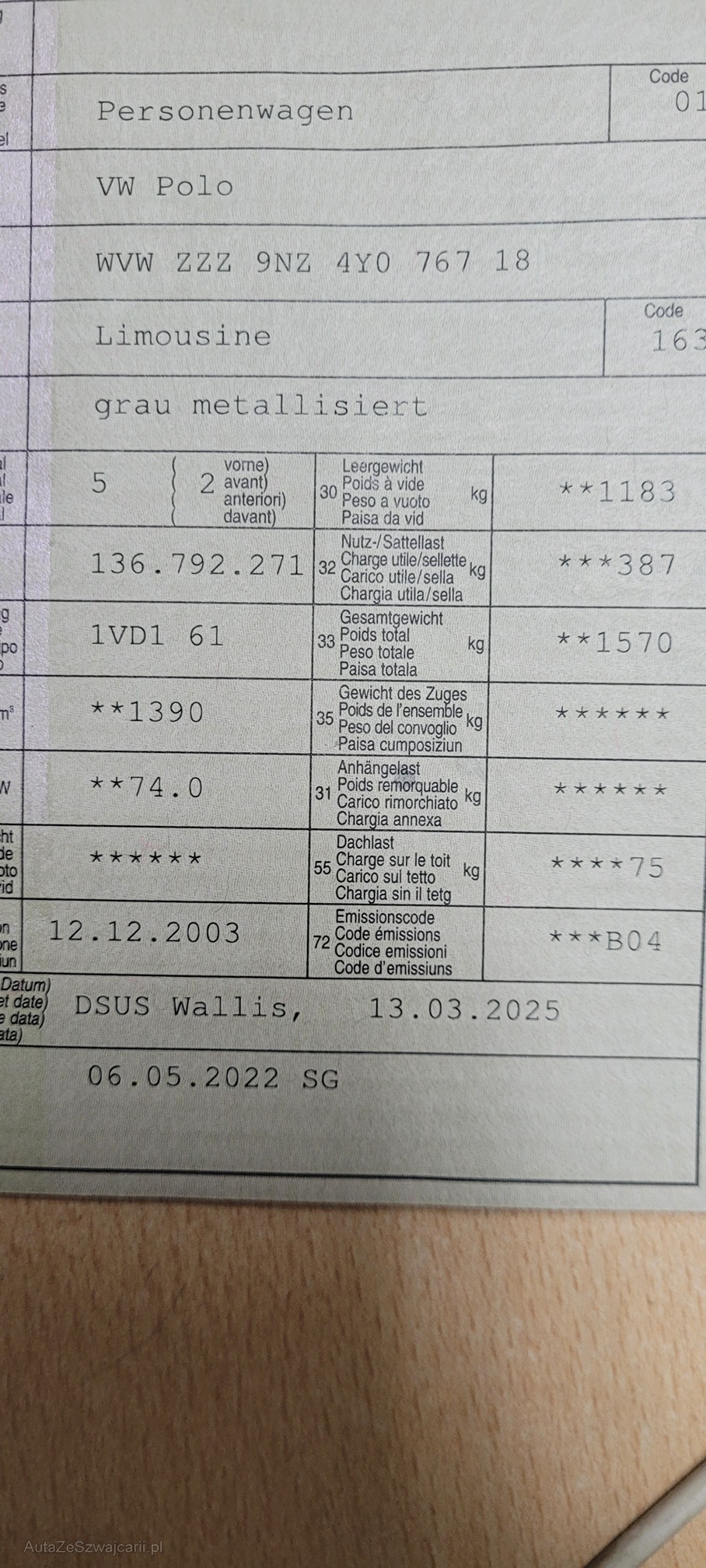 | Kommentar | Am Fahrzeug wurde kein ausführlicher Werkstatt Test durchgeführt. Winterreifen sind gut. Frontscheibe hat ein Steinschlag (siehe Foto) Carrosserie Zustand dem Alter entsprchend, kleinere Kratzer und Parkschäden (sieh Fotos) Das Fahrzeug wird ab Platz ohne Garantie und Nachverhandlung verkauft. |