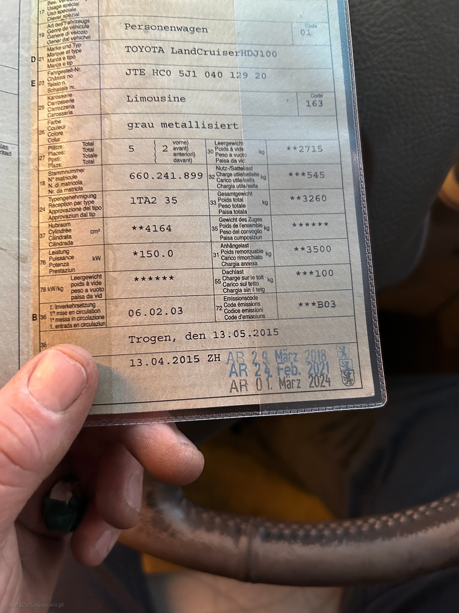 | Kommentar | Getriebeaufhängung macht bei Lastwechsel Geräusch , Stossdämpfer hinten links defekt, Getriebetemperatur bei längeren Bergfahrten mit Anhänger hoch, Fahrzeug wird vom Kunden direkt abgegeben, keine Gewähr unsererseits. |
