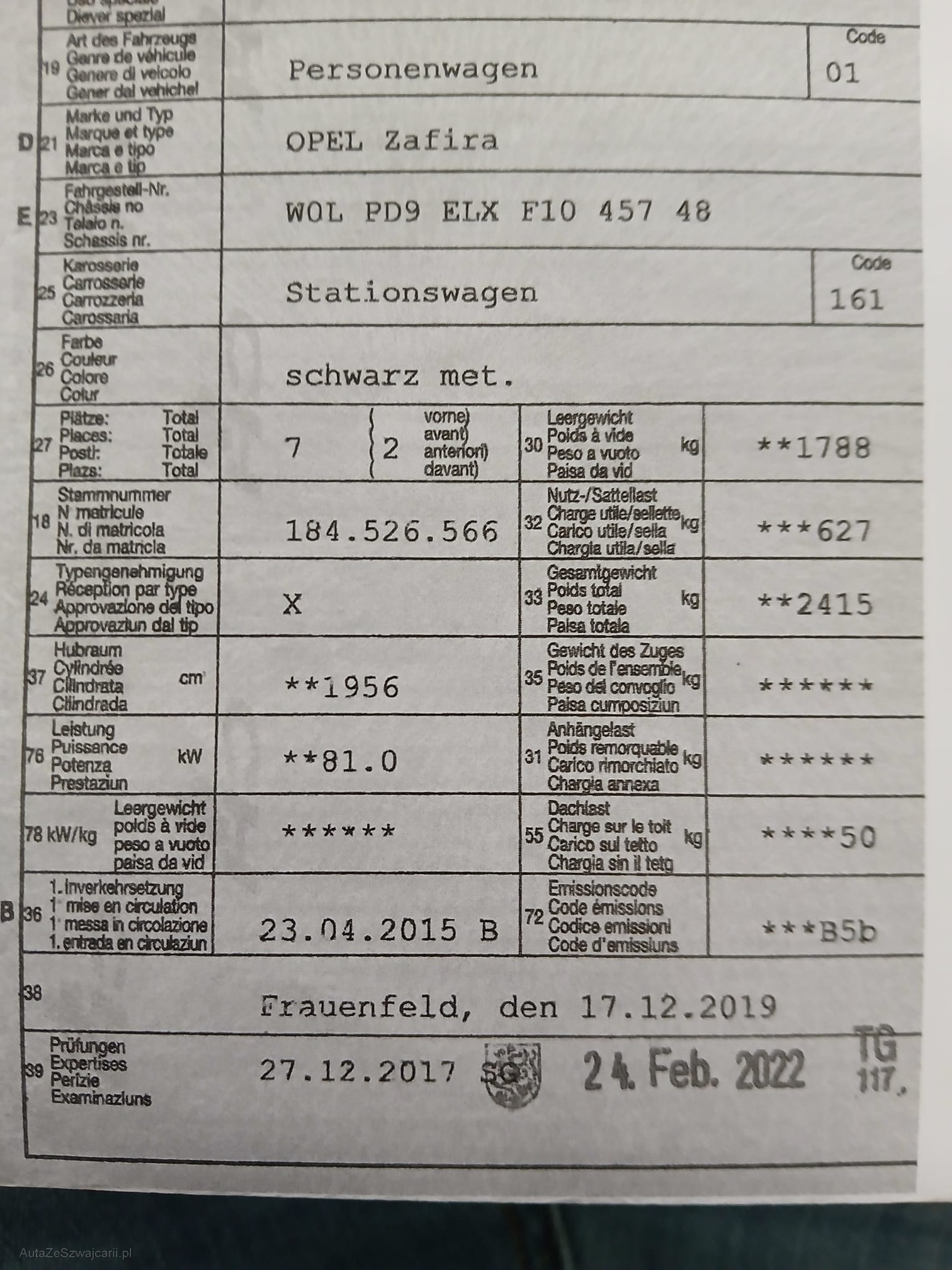 | Kommentar | Technisch nicht geprüft. Fahrzeug läuft und kann gefahren werden, Warnlampen leuchten Keine. Hat 2 Schlüssel und Servicedokument sind vorhanden. Winterreifen montiert mit gutem Profil. Ist innen uns aussen in einem für das alter guter Zustand. Hat auf der hinteren Türe einen kleinen Lackschaden. Fahrzeug muss innert 7 Tage abgeholt werden. (Banküberweisung) |