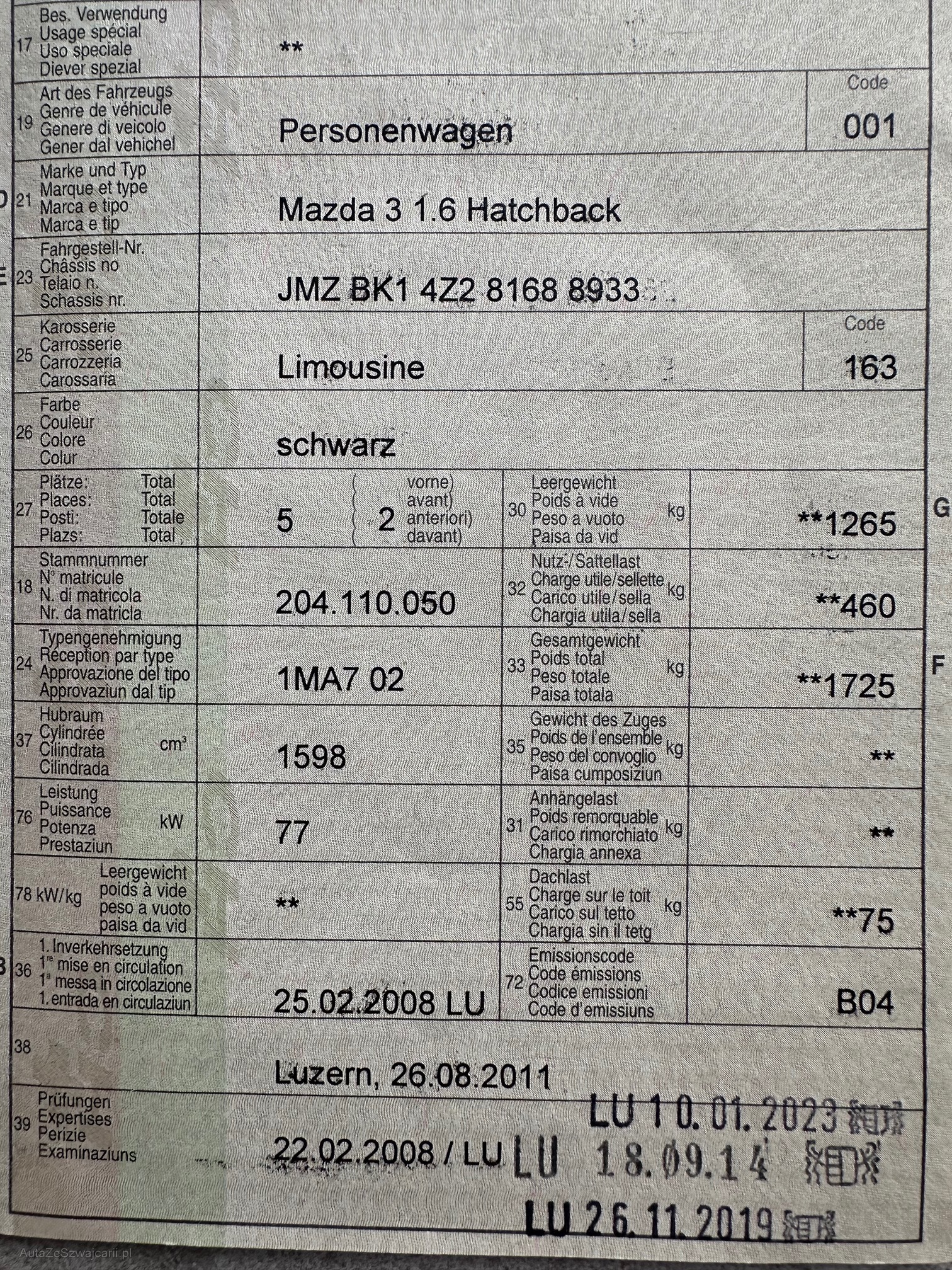 | Kommentar | Es wurde kein erweiterter Werkstatttest durchgeführt. Leichter Hagelschaden. |
