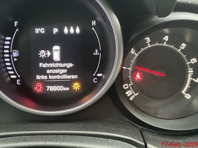 | Serienausstattung | ABS, EBD elektronische Bremskraftverteilung, Dunkel getönte Scheiben hinten, Tempomat, Servolenkung, Assist: Antriebsschlupfregelung (ASR), Aussentemperaturanzeige, Airbag: Window-Kopfairbags, Getönte Scheiben, Sitze: Fahrersitz höhenverstellbar, Licht: Nebelscheinwerfer, Pollenfilter (Staubfilter), Heckscheibenheizung, Aussenspiegel rechts und links beheizbar und elektrisch verstellbar, Wegfahrsperre elektronisch, Elektronische Parkbremse, Start-/Stopp-Automatik, ISOFIX Kindersitzvorrichtung, Verchromtes Auspuffendrohr, Digital Uhr, Stoff-Ausstattung, Gurtstraffer vorne, Elektrische Fensterheber vorne + hinten, Drehzahlmesser, Dachspoiler in Wagenfarbe, Elektronisches Stabilitäts-Programm (ESP), Multifunktionslenkrad mit Radiobedienung, Sequentielles 6-Gang-Getriebe mit Automatikfunktion, Scheibenwischer vorne mit Intervall, Stossstangen in Wagenfarbe, Rücksitzlehne geteilt abklappbar, Zentralverriegelung mit Fernbedienung, Berganfahrhilfe (Hill Holder), Leichtmetallfelgen 17J, Licht: Nebelschlussleuchte, Assist: Bremsassistent (BAS), Airbag: Airbag Beifahrer deaktivierbar, Licht: Tagfahrlicht, Räder: Reifendruck-Kontrollanzeige, Klimaanlage, Lenkrad: Lederlenkrad, Instrumententafel mit LCD Display, 3-Punkt-Sicherheitsgurte auf allen Plätzen, Airbag Fahrer und Beifahrer inkl. Seitenairbags, Autoradio mit Touchscreen, Bedienelement am Lenkrad, Bluetooth, Multimediasystem Uconnect (Freisprecheinr.,USB, AUX),DAB+, Licht: Drittes Bremslicht, Schalthebelknauf in Leder, Heckscheiben-Wisch-/Waschanlage, Katalysator geregelt, Lenkrad: Lenkrad längs- und höhenverstellbar |