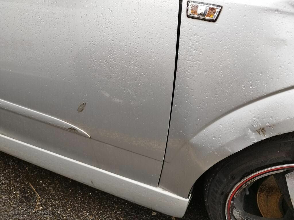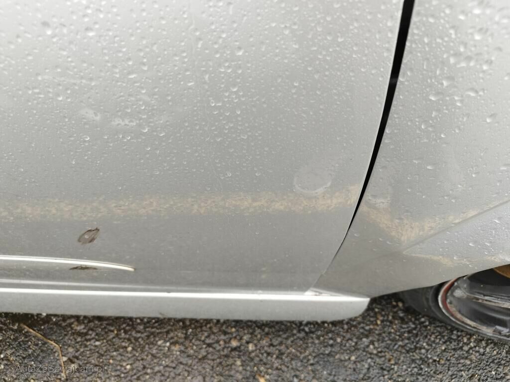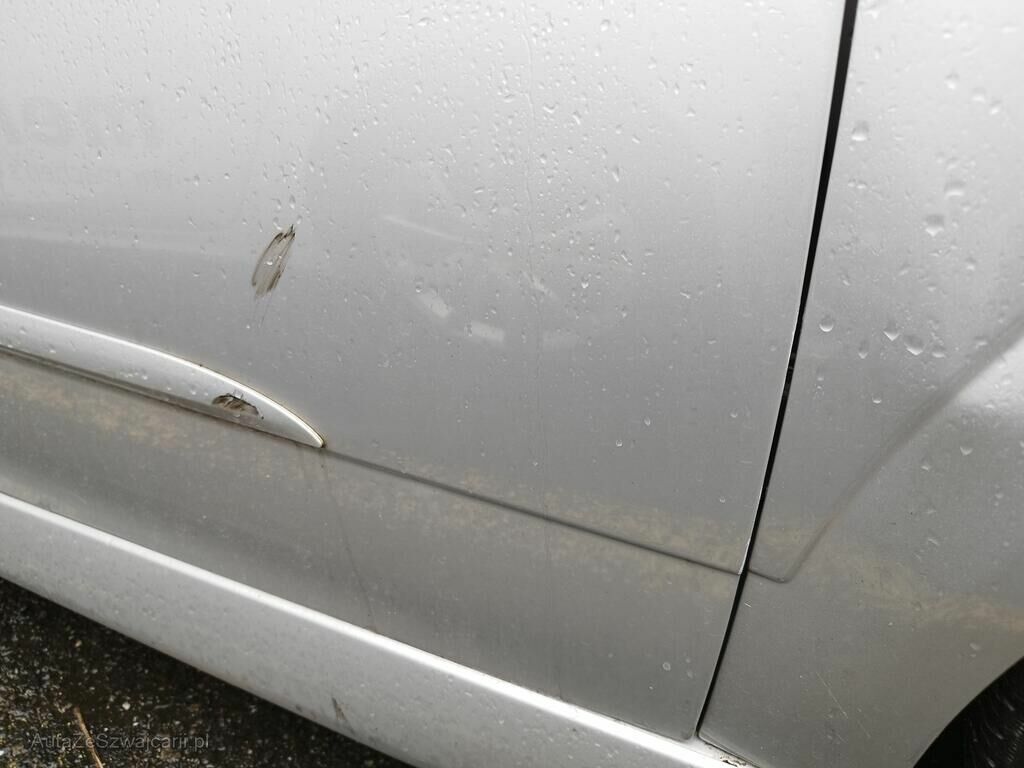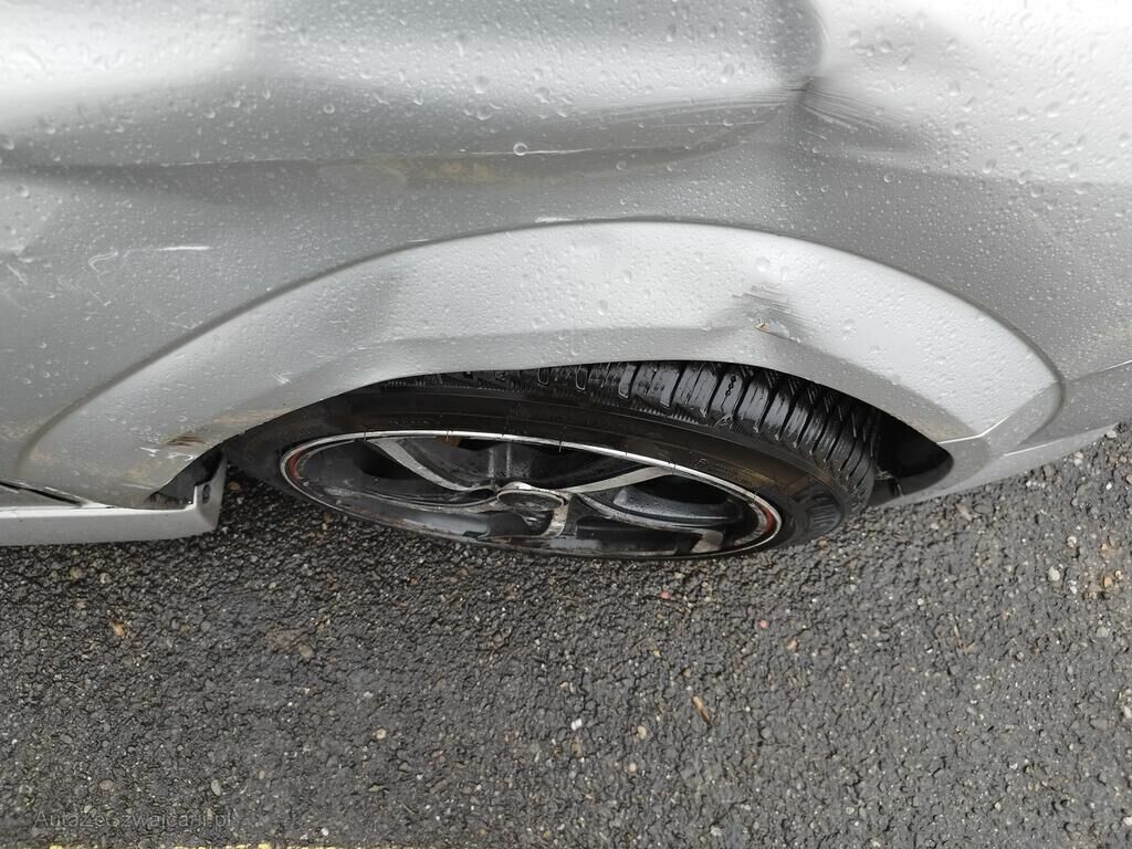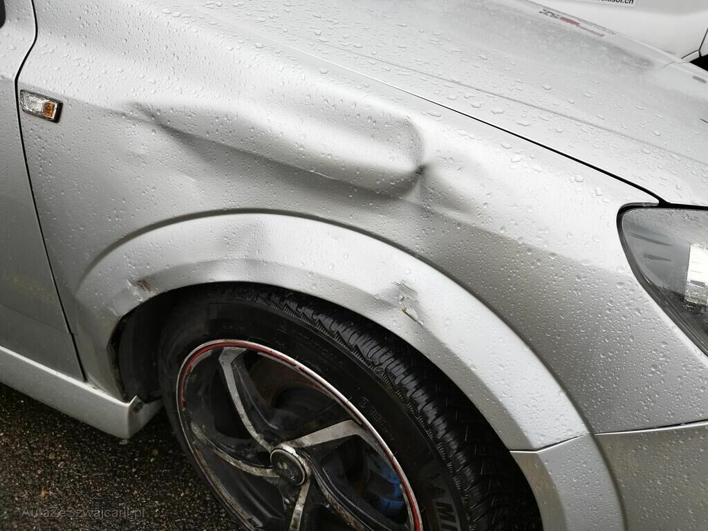 Die Stossstange vorne rechts ist gerissen, der Kotflügel vorne rechts ist deformiert, die Türe vorne rechts hat eine Delle und Kratzspuren, die Schwellerverkleidung rechts hat Kratzspuren, die Felge vorne rechts hat Kratzspuren, das Rad vorne rechts steht schräg.