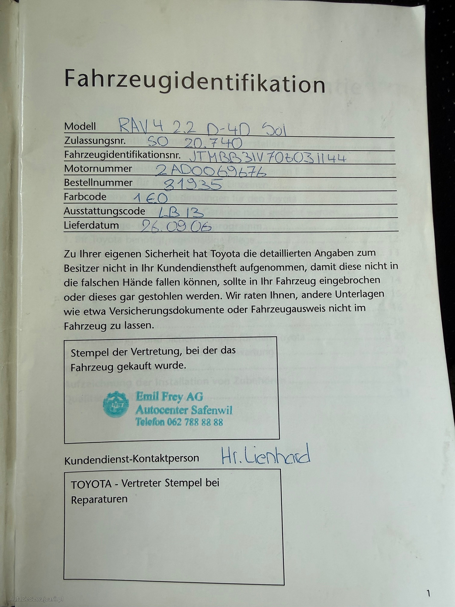 | Kommentar | Fahrzeug hat im Mai 2012 mit 140‘889 km einen neuen Motor erhalten! ab Platz und ohne Garantie! Fahrzeug kann mit Voranmeldung besichtigt werden. |