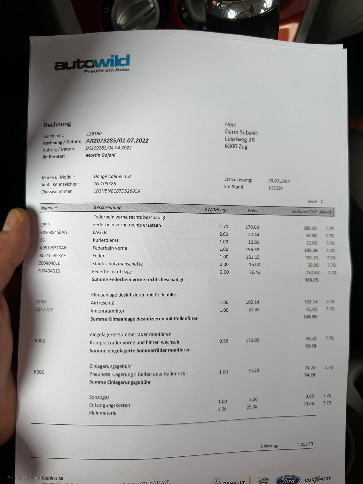 | Kommentar | kurze Probefahrt gemacht alles Funktioniert. Fährt sich sehr schön. Stossdämpfer vorne macht Geräusch (EINE SCHON GEWESCHSELT) Sehr viel Geld investiert in letzte Zeit, Rechnungen BEIGELEGT Macht sehr saubere Eindruck Karoserie hat Gebrauchtspuren wie auf dem Bilder ersichtlich ist Am Fahrzeug wurde kein Werkstatttest gemacht (Für sichtbare oder nicht sichtbare Mängel wird nicht gehaftet). Wir testen & kontrollieren nicht alle Funktionen des Fahrzeugs. Das Risiko liegt somit vollumfänglich beim Käufer. Ab Platz ohne Garantie, Wandelung und Minderung werden wegbedungen. Stossstange vorne zerkratzt, Nach erteilte Zuschlag muss Fahrzeug innerhalb 4 Arbeitstage abgeholt und Bar bezahlt werden. Sonst wird Parkplatz CHF 30.- / Tag verrechnet |