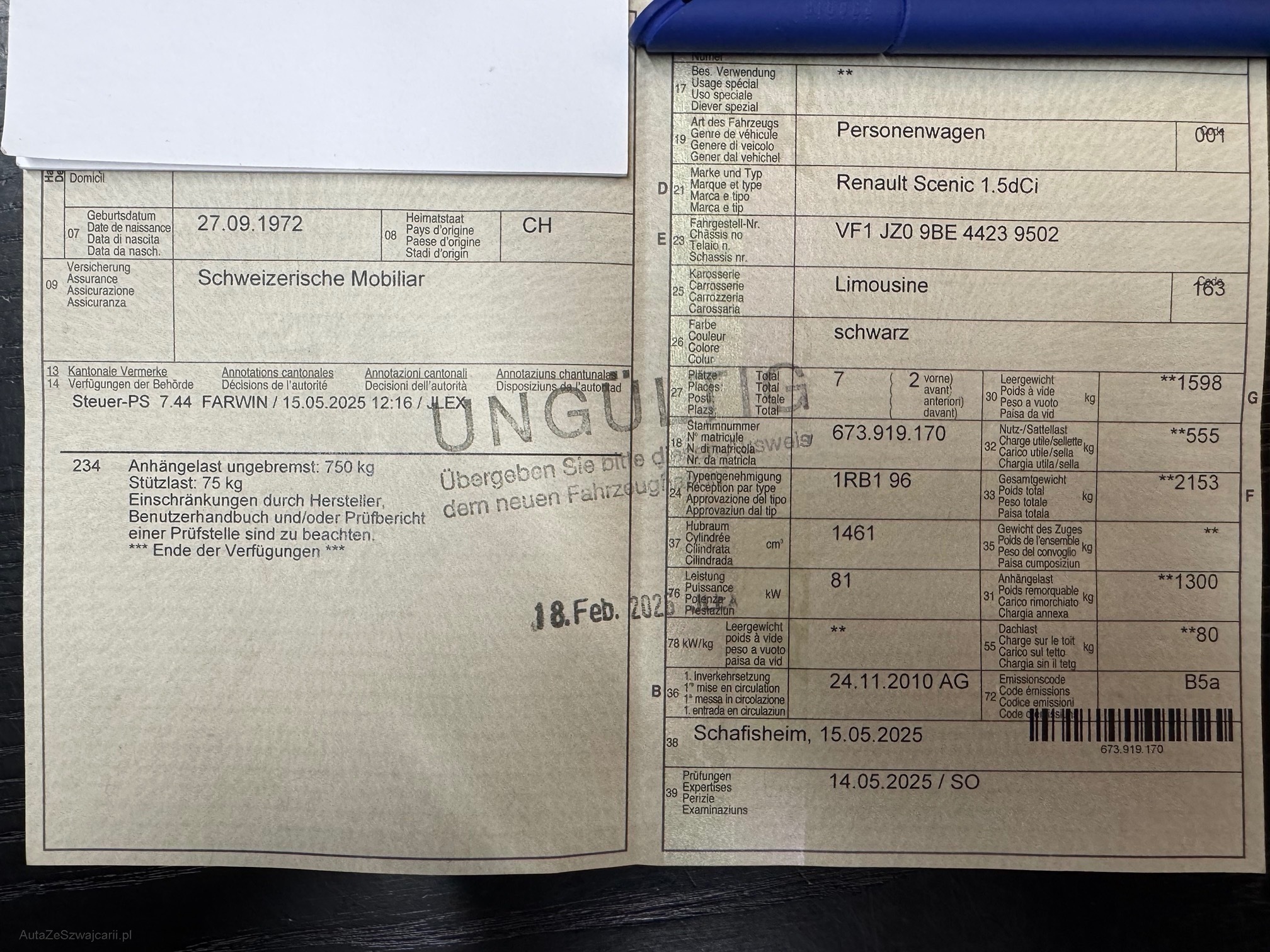 | Kommentar | Motorkontrollleuchte Abgassystem prüfen Fahrzeug fährt normal. MFK 14.05.2025 2X Winterreifen zu ersetzen siehe Fotos. Optisch ist das Fahrzeug von draussen so wie von innen sehr gepflegt. Am Fahrzeug wurde kein Werkstatttest gemacht (Für sichtbare oder nicht sichtbare Mängel wird nicht gehaftet). Wir testen & kontrollieren nicht alle Funktionen vom Fahrzeug. Das Risiko liegt somit vollumfänglich beim Käufer. Nachdem der Höchstbietende den Zuschlag erhalten hat, gibt es keine Nachverhandlung, auch wenn nicht deklarierte Mängel zum Vorschein kommen sollten. Ab Platz ohne Garantie, Wandelung und Minderung werden wegbedungen. Abholung nach Zuschlag innert 4 Tagen. |