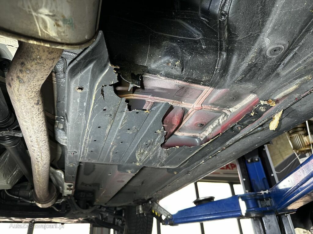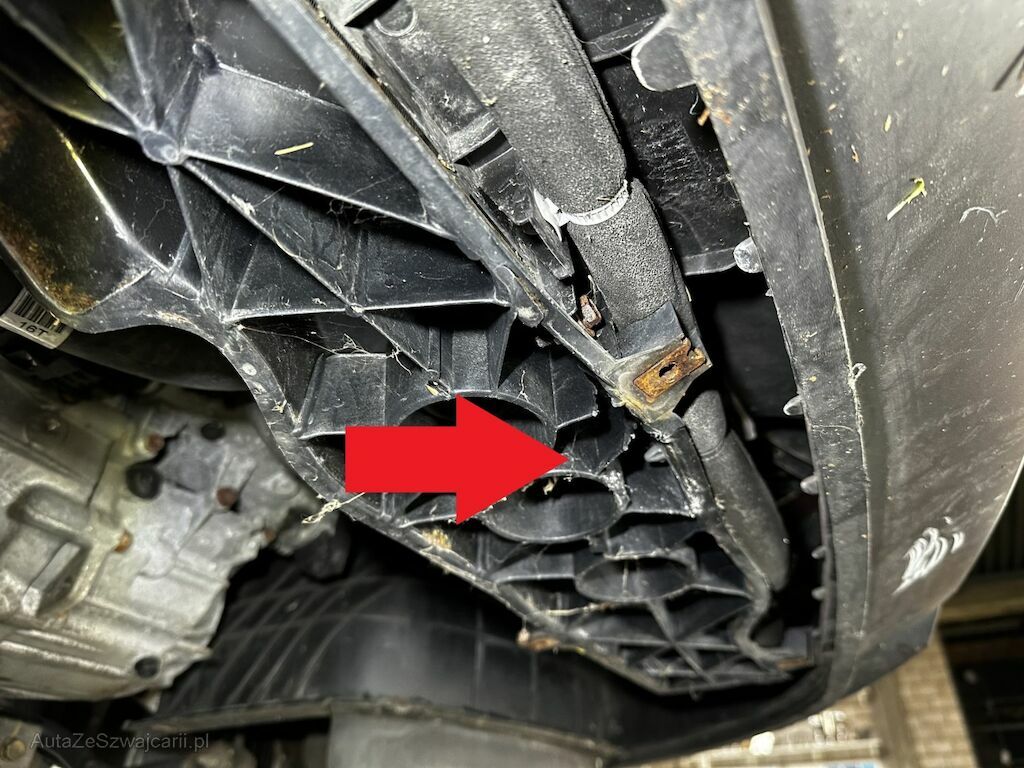 Anprall am Fahrzeugunterboden: Dabei wurden diverse Unterbodenverkleidungen, die Frontverkleidung unterhalb sowie das Frontmodul beschädigt und deformiert.