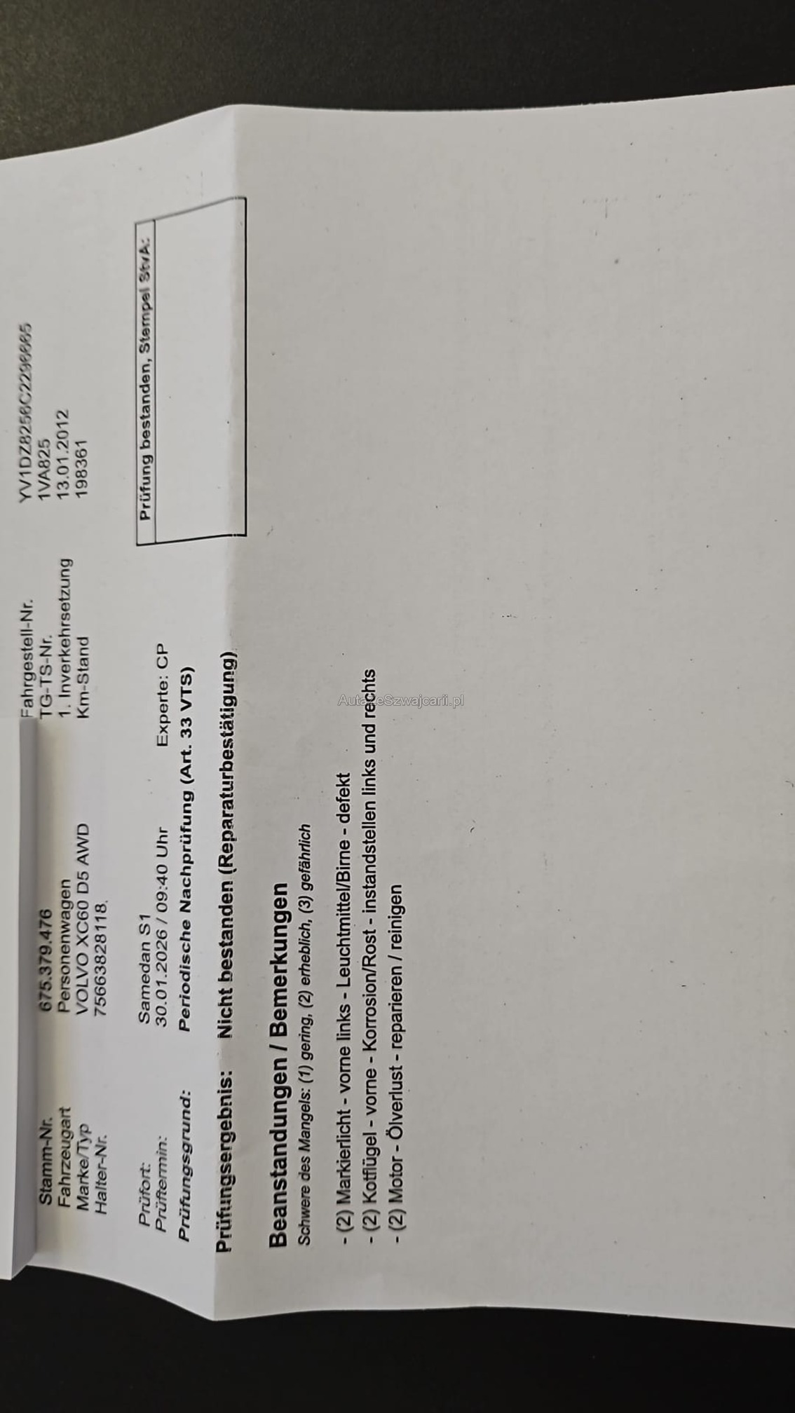| Kommentar | MFK Prüfung nicht bestanden 30.01.2026 Mängel gemäss Prüfbericht: - Markierlicht vorne L Leuchtmittel defekt - Kotflügel vorne L und R korrosion instandsetzen - Motor Oelverlust rep./reinigen "Jede Gewährleistung, soweit nach Gesetz möglich, wird wegbedungen, insbesondere sind Wandelung und Minderung ausgeschlossen" |
