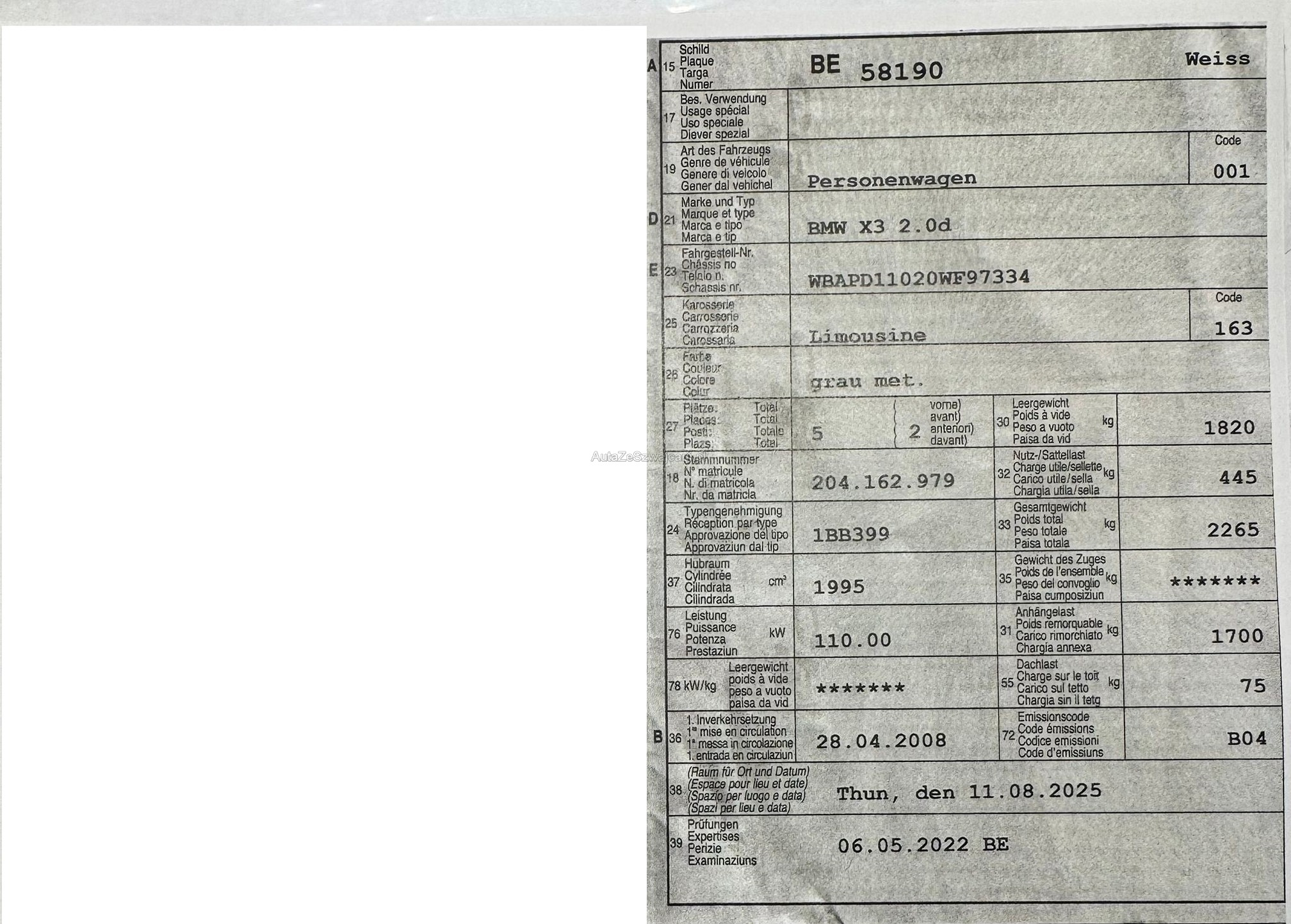 | Kommentar | Es wurde kein Eintauschtest gemacht. Fahrzeug Optisch in einem guten Zustand (siehe Fotos) |
