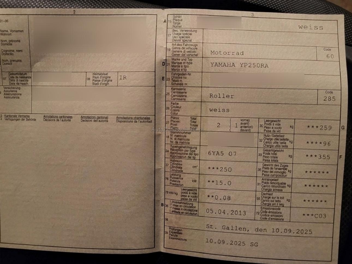 | Zusatzinformationen | Scooter wird ohne Handwärmer und Top-Case verkauftDie (vom Fahrzeugexperten) ermittelten Reparaturkosten beziehen sich auf das versicherte Ereignis. Allfällige zusätzliche, nicht versicherte Schäden/Vorschäden, sind in den Reparaturkosten nicht enthalten. Die deklarierten Ausstattungsmerkmale können von der effektiven Ausstattung abweichen.AchtungBei einem Hochvoltsystem - Spannungsfreiheit prüfen. Sicherheitshinweise und Betriebsanleitungen des Herstellers konsultieren und befolgen. |
