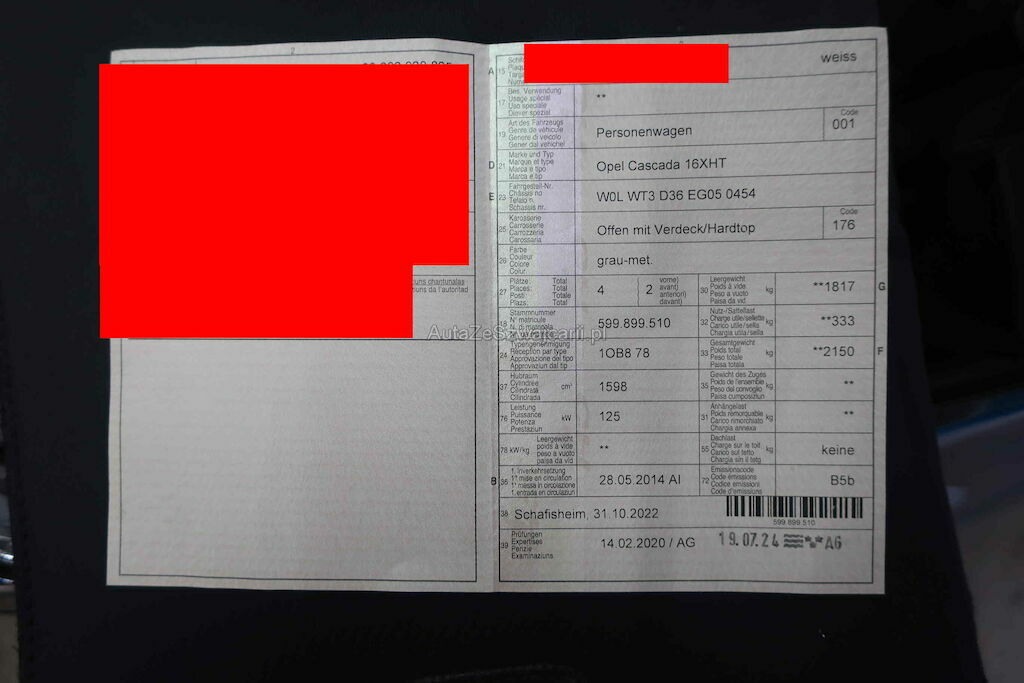 | Typ | CASCADA 1.6I TURBO COSMO |