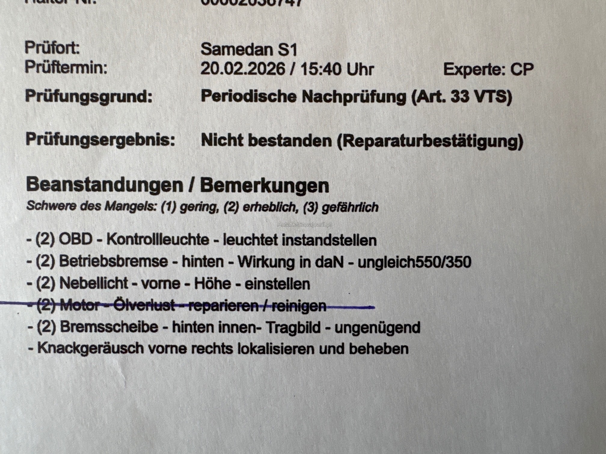 | Kommentar | Letzter Service am 09.12.2024 bei 146'220Km Letzte MFK am 20.02.2026 (Mängel werden nicht behoben, Verkauf mit Mängeln) DPF wurde duch die MFK kontrolliert (kein Ausdruck) Bekannte Mängel: - Dellen, Kratzer, Gebrauchsspuren und Korrosion (siehe Fotos) - Diverse MFK Mängel (siehe Prüfbericht) - Schaden vorne rechts (siehe Fotos) - Verschmutzer innenraum (siehe Fotos) Kein Werkstatttest und keine Probefahrt durchgeführt! Jede Gewährleistung, soweit nach Gesetz möglich, wird wegbedungen. Insbesondere sind Wandelung und Minderung ausgeschlossen. |