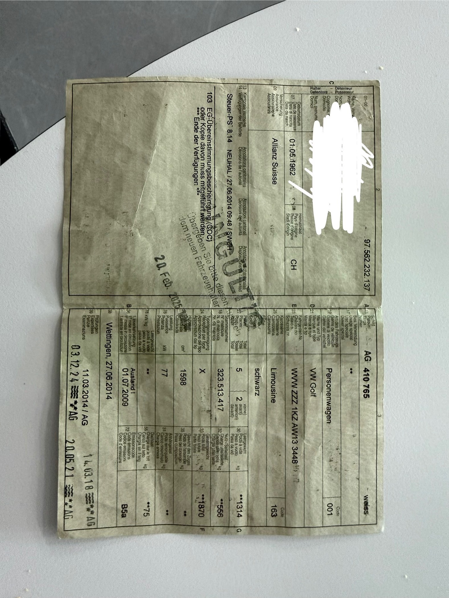 | Kommentar | Keine Kontrolle durchgeführt. Dem Alter entsprechende Gebrauchsspuren - siehe Bilder. Fahrzeug fährt sich gut. Wandelung / Minderung ausgeschlossen. Abholung innert 5 Arbeitstagen. |