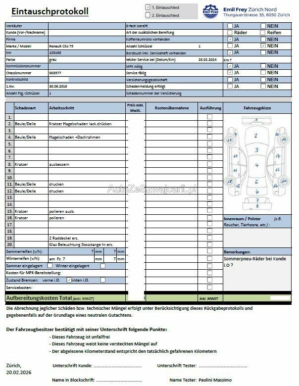 | Information | Keine technische Prüfung (Werkstatttest) vorgenommen Diverse Schäden an Karosserie/Lack. Fahrzeug ab Platz, ohne Garantie und Aufbereitung. DPF/FAP Filter nicht kontrolliert Keine Gewähr auf die Angaben der Sonder- und Serienausstattung / keine mechanische Prüfung. Fahrzeug wurde unzerlegt expertisiert / keine Haftung für allfällige, nach Demontage bekanntwerdenden Mängel. Fahrzeugbereifung und Ausstattung gemäss Fotos / Fahrzeugkauf auf eigenes Risiko ab Platz ohne Nachwährschaft. - Div. Kratzer und Beulen - Hagelschaden - 2 defekte Raddeckel |