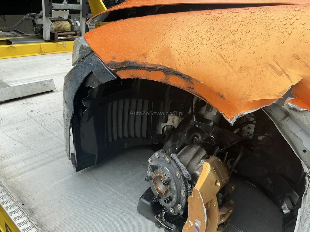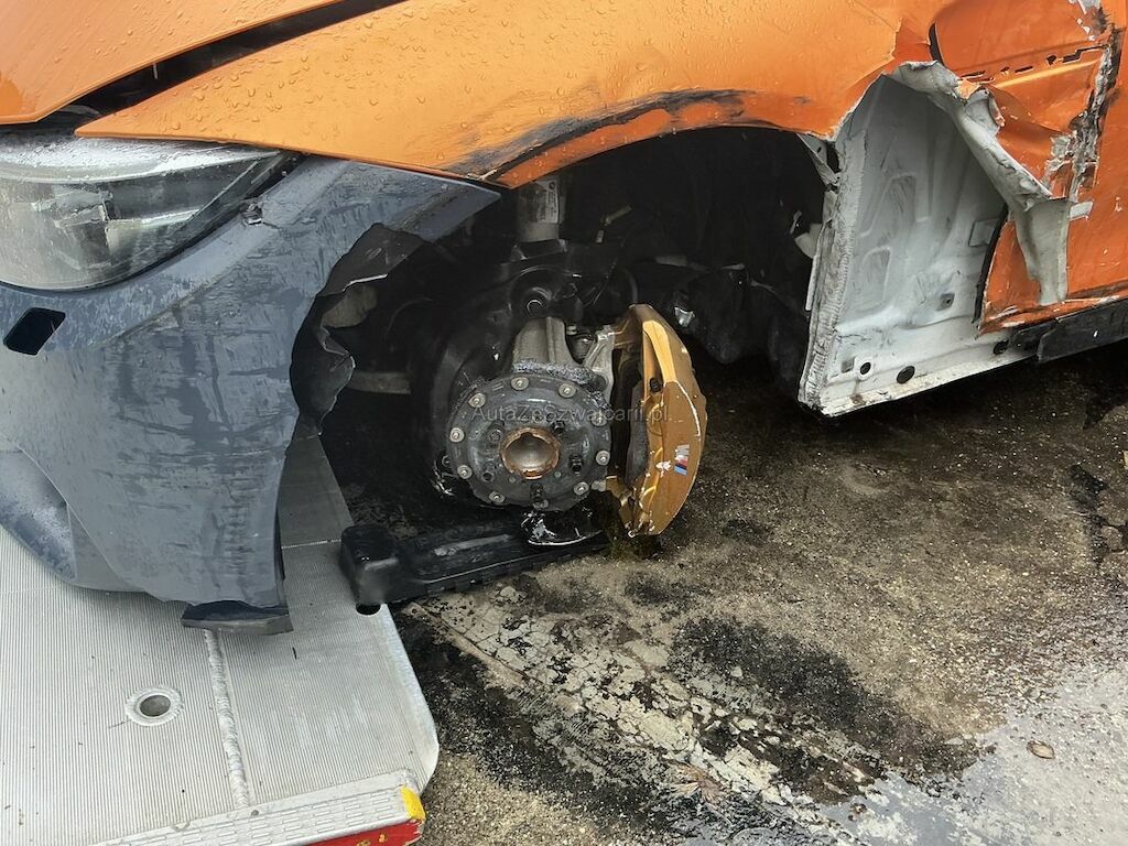 Jantes, pneu, frein avant gauche, pare-chocs, support, traverse, moulure, phare, radiateur, suspension, direction, aile, porte, montant A, aile arrière, pare-chocs arrière et transmission arrière endommagés. Ceintures de sécurité déclenchées