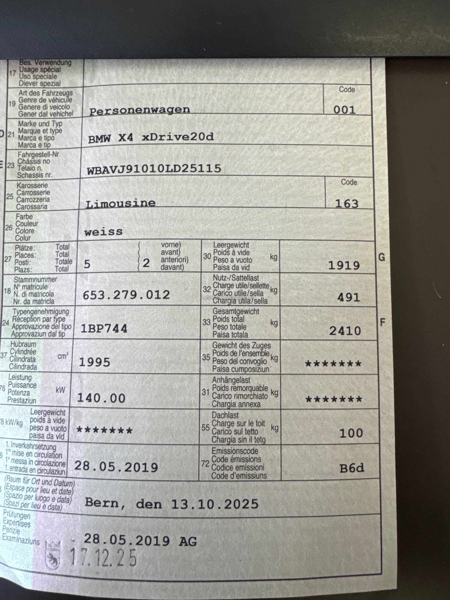 | Kommentar | - gepflegtes Fahrzeug - Fahrzeug noch im Kundenbesitz - Fährt und schaltet gut - Ab MFK 17.12.2025 Zustand gemäss Fotos. Ab Platz ohne Garantie. Motor läuft. Am Fahrzeug wurde kein Werkstatttest gemacht (Für sichtbare oder nicht sichtbare Mängel wird nicht gehaftet). Wir testen & kontrollieren nicht alle Funktionen vom Fahrzeug. Das Risiko liegt somit vollumfänglich beim Käufer. Um Missverständnisse zu vermeiden kann das Fahrzeug auf Voranmeldung besichtigt & getestet werden, sollten Sie davon bewusst kein Gebrauch machen dann liegt die Verantwortung bei Ihnen. Nachdem der Höchstbietende den Zuschlag erhalten hat, gibt es keine Nachverhandlung, auch wenn nicht deklarierte Mängel zum Vorschein kommen sollten. Ab Platz ohne Garantie, Wandelung und Minderung werden wegbedungen |
