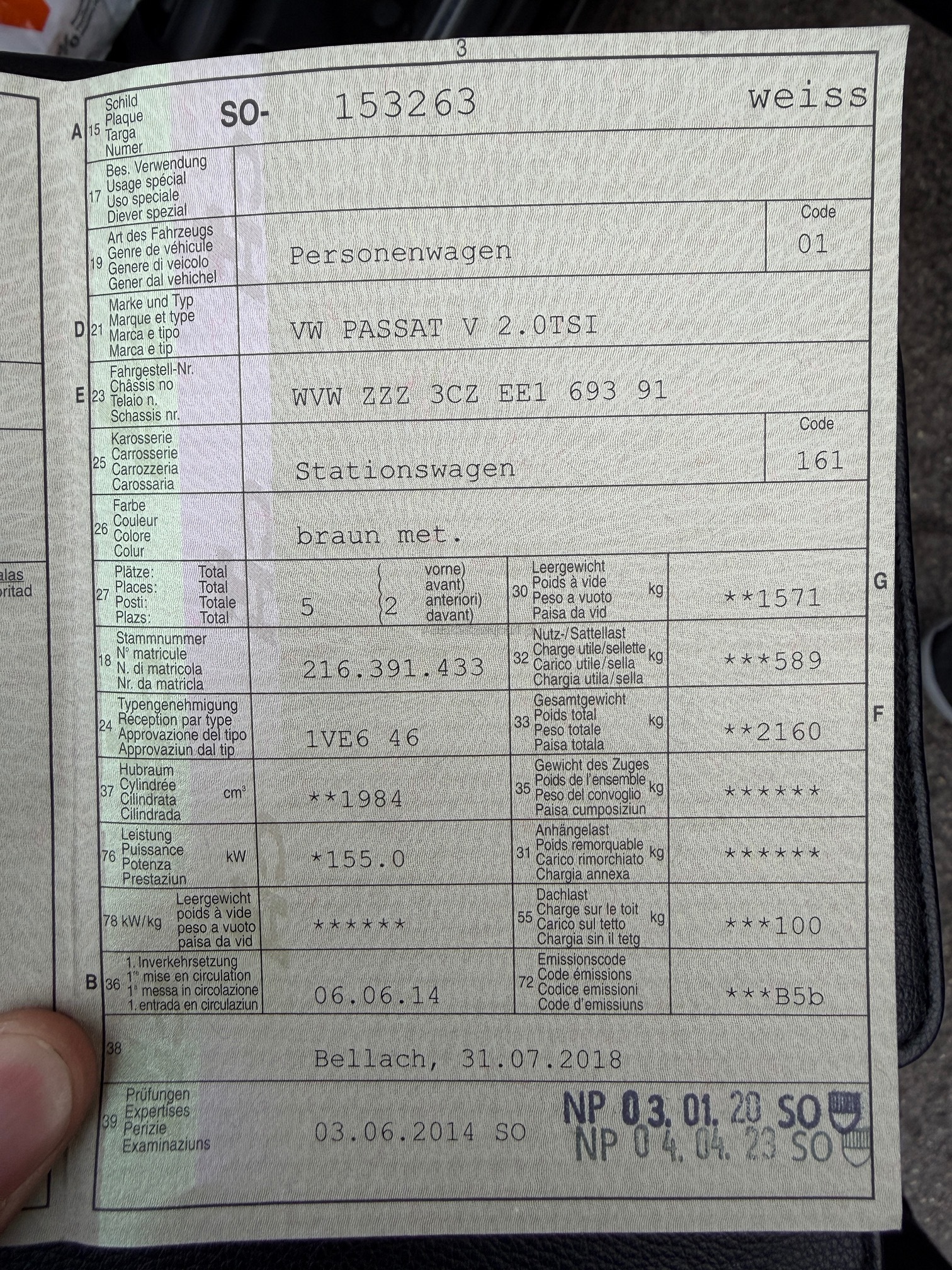 | Kommentar | Hagelschaden auf der Haube, Diverse Beulen und Kratzer, siehe Bilder, Spiegel rechts klappt nicht mehr ein. Alle Service bei Amag gemacht, Auto fährt täglich. Wir haben keinen Werkstatttest durchgeführt. Kunde wird den Wagen ziemlich sicher ab 6000.- abgeben. |