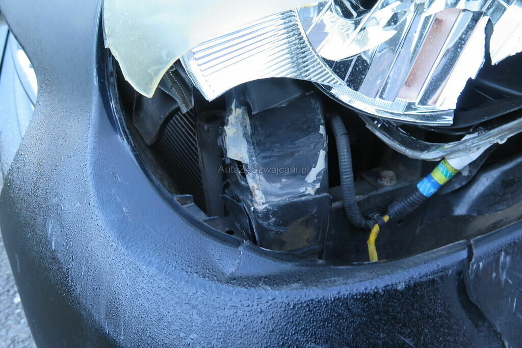Pare-chocs avant enfoncé et cassé, aile avant gauche enfoncée, phare cassé, armatures intérieures refoulées, risque train avant faussé.
