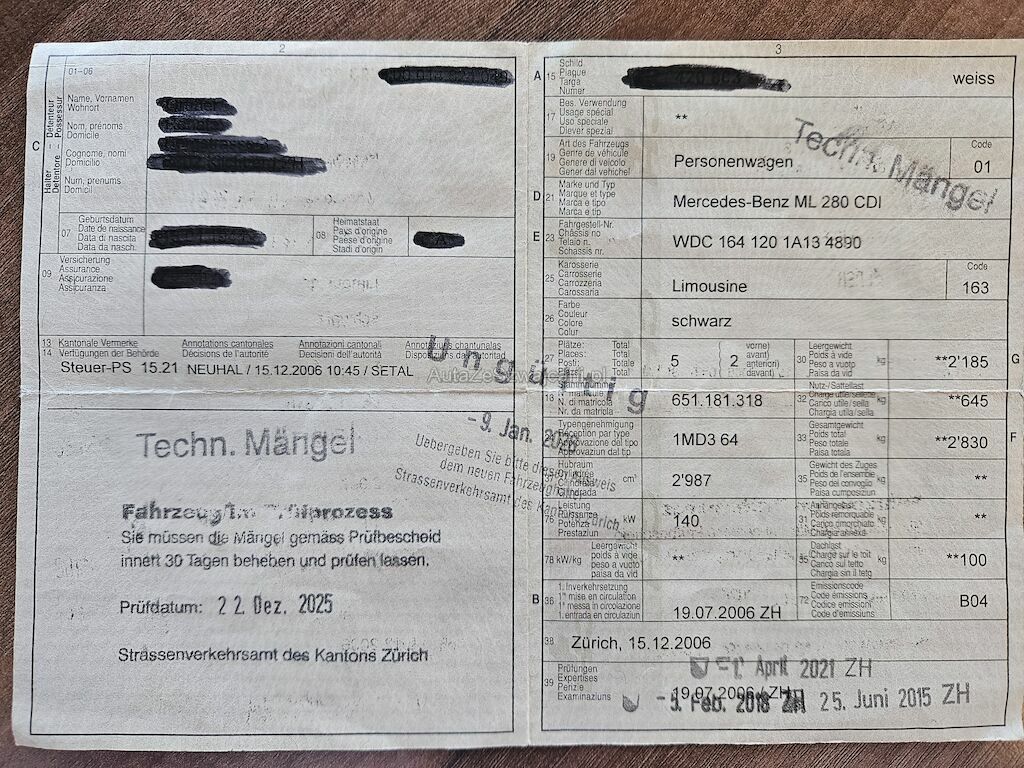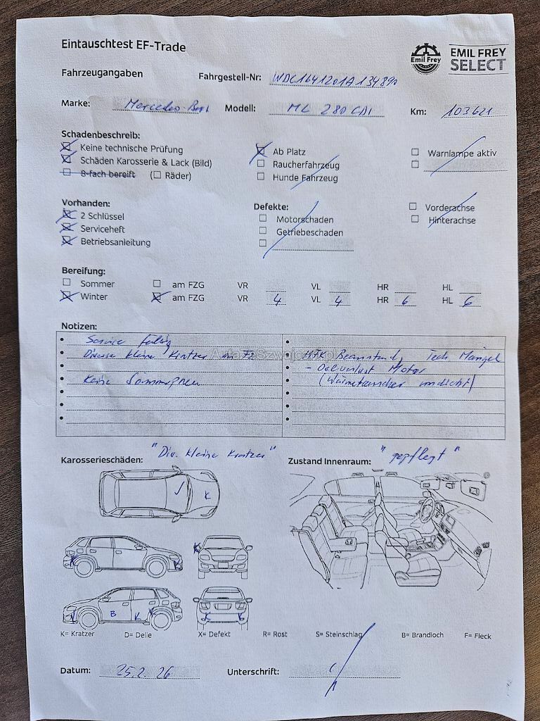 | Information | MFK Beanstandung Tech. Mängel (Oelverlust Motor) Wärmetauscher undicht div. kleine Kratzer am Fz. Innenraum gepflegt |