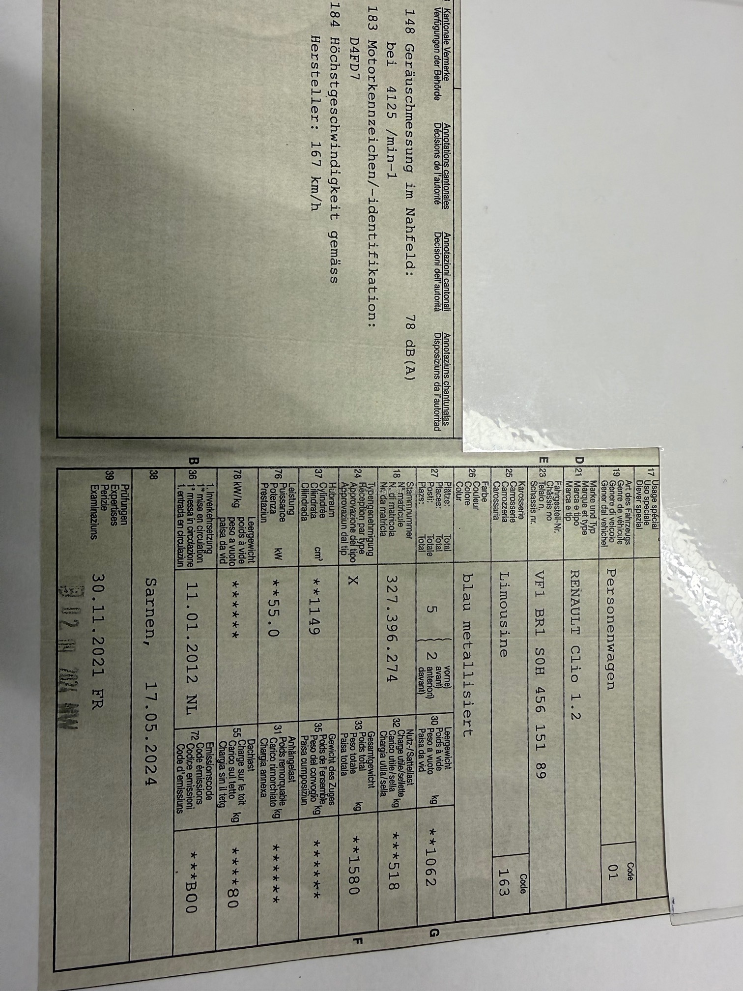 | Kommentar | Fahrzeug hat diverse Kratzer und Beulen, keine technische Prüfung. Ab Platz ohne Garantie. Jede Gewährleistung soweit nach Gesetz möglich wird wegbedungen insbesondere Wandelung und Minderung. Fahrzeug muss nach Kauf innerhalb 5 Arbeitstagen abgeholt werden. Standplatzgebühren 20.- |