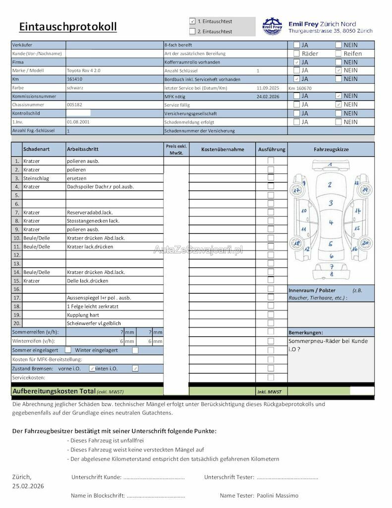 | Information | Keine technische Prüfung (Werkstatttest) vorgenommen Diverse Schäden an Karosserie/Lack. Fahrzeug ab Platz, ohne Garantie und Aufbereitung. DPF/FAP Filter nicht kontrolliert Keine Gewähr auf die Angaben der Sonder- und Serienausstattung / keine mechanische Prüfung. Fahrzeug wurde unzerlegt expertisiert / keine Haftung für allfällige, nach Demontage bekanntwerdenden Mängel. Fahrzeugbereifung und Ausstattung gemäss Fotos / Fahrzeugkauf auf eigenes Risiko ab Platz ohne Nachwährschaft. - Div. Kratzer und Dellen am Fahrzeug - Kleiner Steinschlage auf der Frontscheibe |