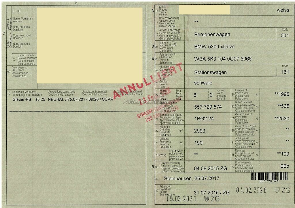 | Information | Keine Gewähr auf die Angaben der Sonder- und Serienausstattung / keine mechanische Prüfung. Fahrzeug wurde unzerlegt expertisiert / keine Haftung für allfällige, nach Demontage bekanntwerdenden Mängel. Fahrzeugbereifung und Ausstattung gemäss Fotos / Fahrzeugkauf auf eigenes Risiko ab Platz ohne Nachwährschaft. - Div. Dellen und Kratzer am ges. Fahrzeug. - Nur 1x Schlüssel - Letzter Service 01.26 bei 223'297 - Bremsen, AC-Kompressor und Stossdämpfer neu! |