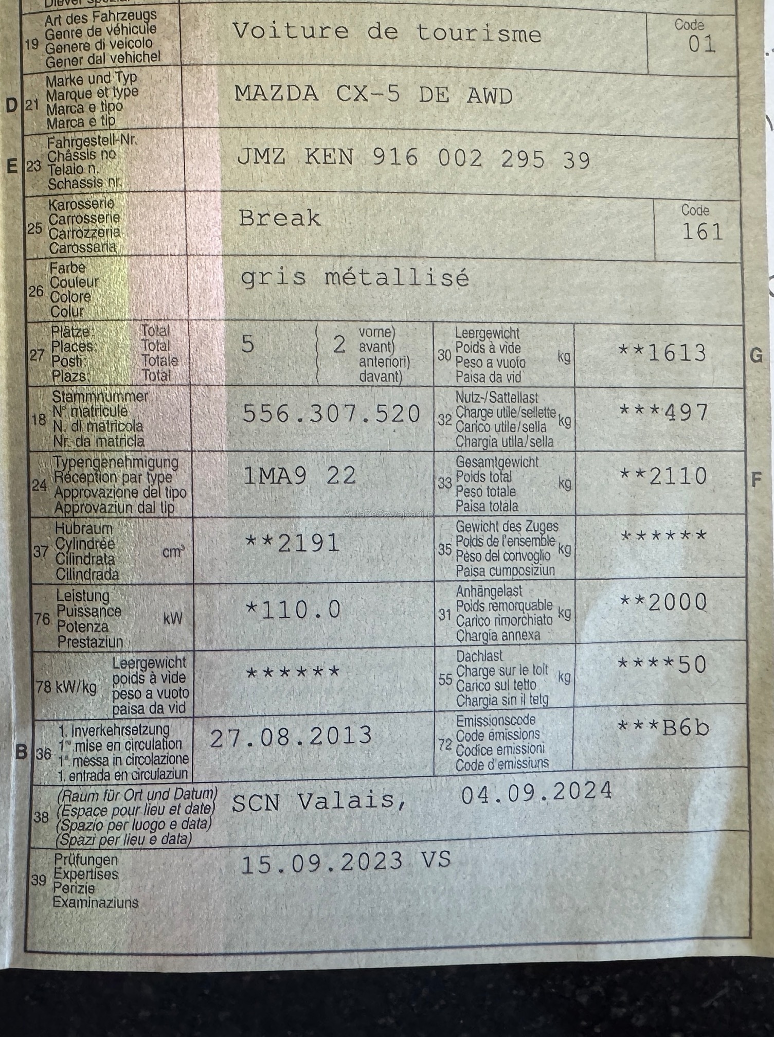 | Kommentar | Aucun test d’atelier n’a été effectué sur le véhicule (aucune responsabilité n’est acceptée pour les défauts visibles ou non visibles). Nous ne testons ni n’inspectons toutes les caractéristiques du véhicule. Le risque incombe donc entièrement à l’acheteur. Après avoir reçu le contrat, il n’y a pas de renégociation, même si des défauts non déclarés sont révélés. Depuis le lieu sans garantie ni garantie, la conversion et la réduction sont assurées. À venir chercher dans les 5 jours ensuite des frais de 15fr par jour sont facturés. |
