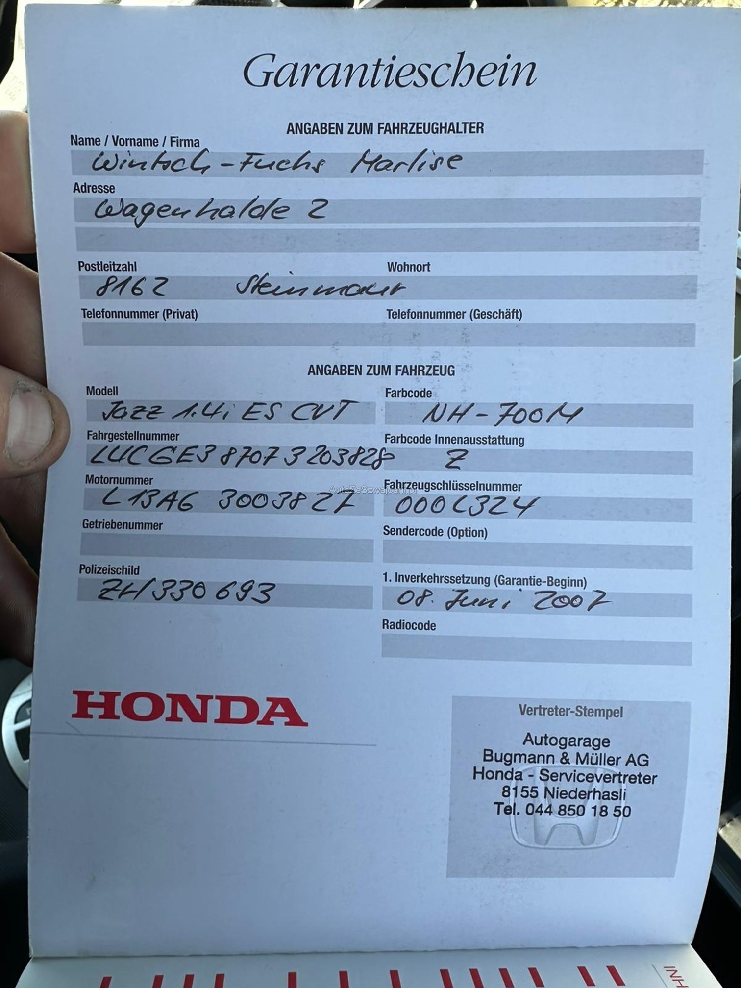 | Kommentar | Frontschaden wie auf den Bildern ersichtlich, Auto ist Fahrbar, kein Flüssigkeitsverlust. Service Fällig Fahrzeug ohne Garantie ab Platz Abholung nach Zusage innert 10 Tagen, ansonsten wir eine Standgebühr von 15.- Fr. pro Tag verlangt. |
