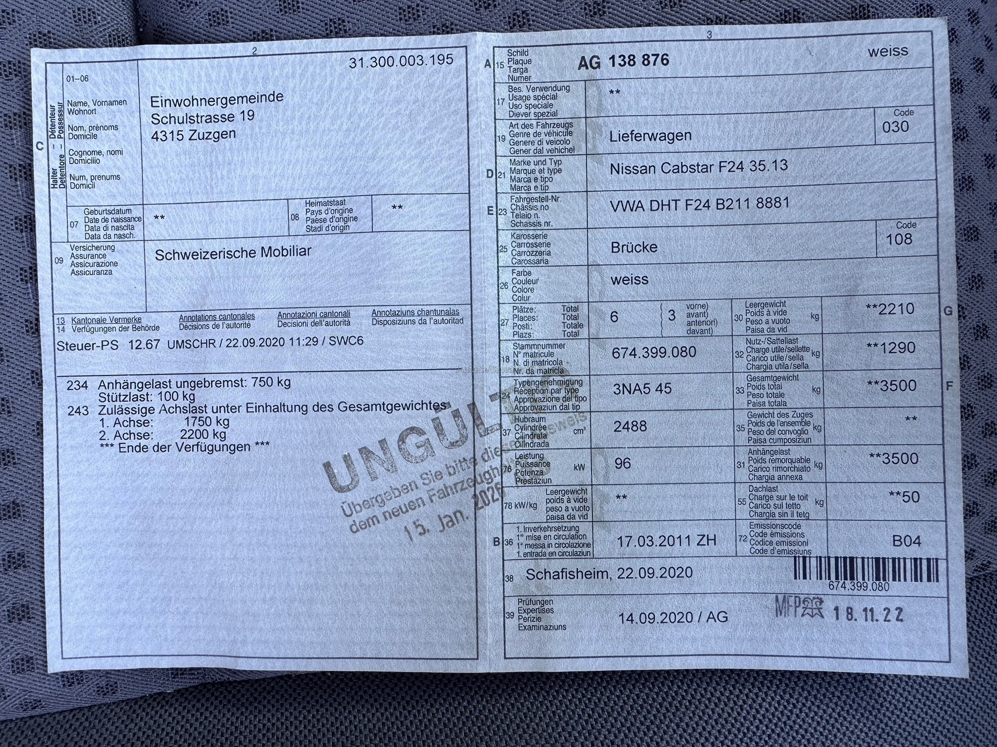 | Kommentar | Mangelbericht -> nicht abschliessend ROST Standlicht vorne rechts nicht i.O Rücklicht HL nicht i.O Hinten links Stossstange verbogen Beulen diverse vorhanden Bremsleitungen 7 Stück verrostet Stabi hinten Spiel Radlager VL Spiel Auspuffendtopf Löcher Rad hinten beidseitig Spiel Ladefläche unterbau verrostet Radlauf beidseitig vorne verrostet Reifen abgelaufen usw |