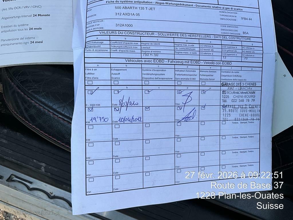 | Sonderausstattung | Leichtmetallräder Abarth Kit SS mit 10 Speichen 17J, Perleffekt-Lackierung Iris-Weiss, Licht: Bi-Xenon Lichtanlage, KIT ABARTH SS ROSSO: Türkleber Abarth + Aussenspiegel rot, Schalthebelknauf aus Aluminium |