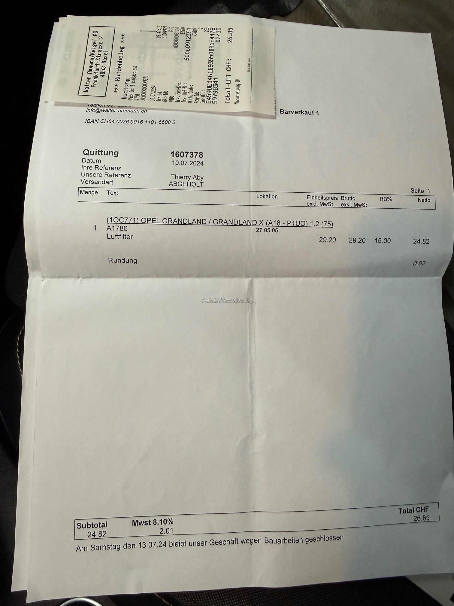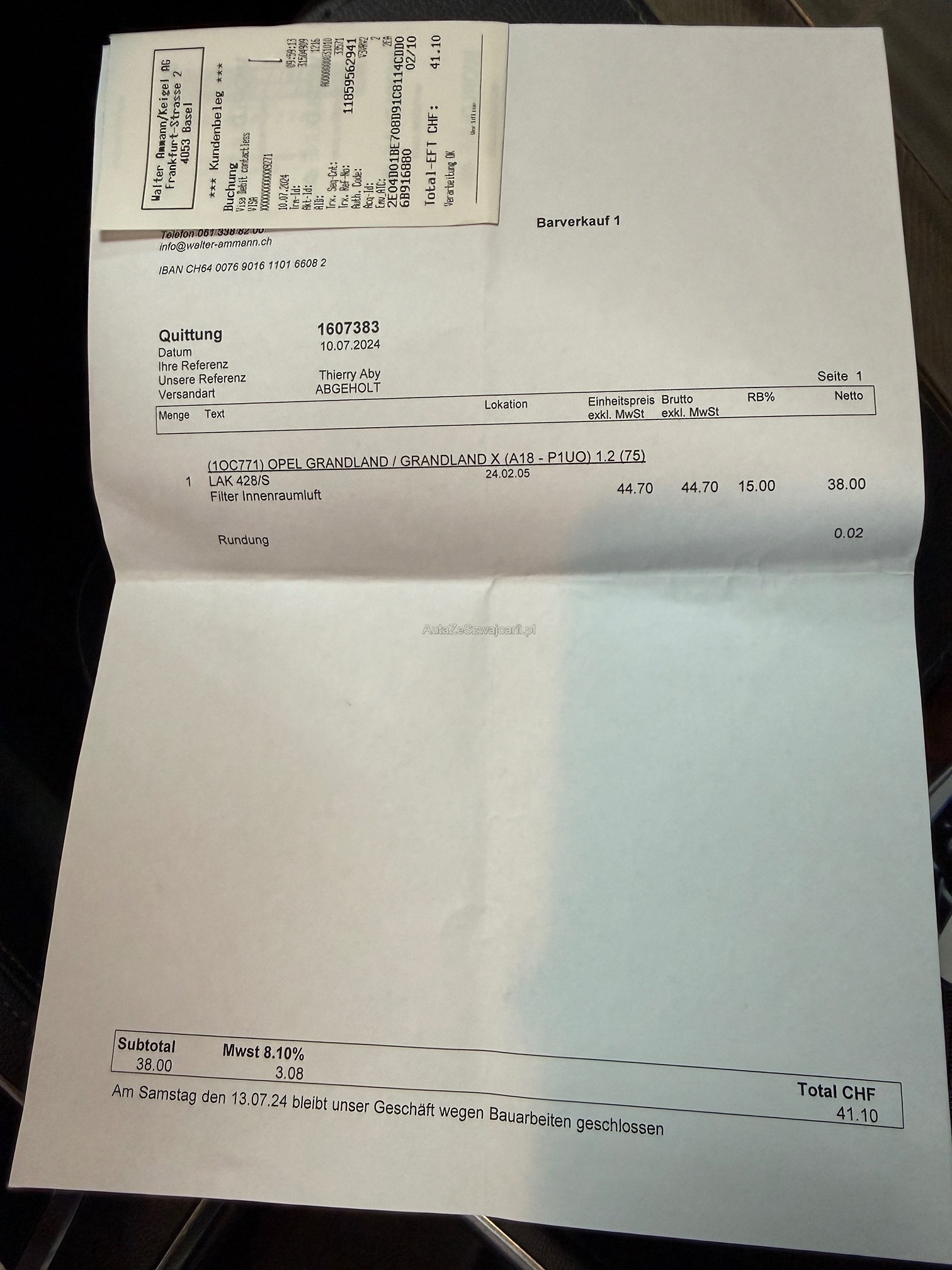 | Kommentar | Eintauschfahrzeug ohne technische Kontrolle. Schaden an Stosstange wird nächste Woche über Versicherung vom Kunden repariert. Frontscheibe hat kleinen Steinschlag. Fährt sich ohne Probleme - kleine Runde auf Platz gefahren. Wandelung / Minderung ausgeschlossen. Abholung innert 5 Arbeitstagen. |