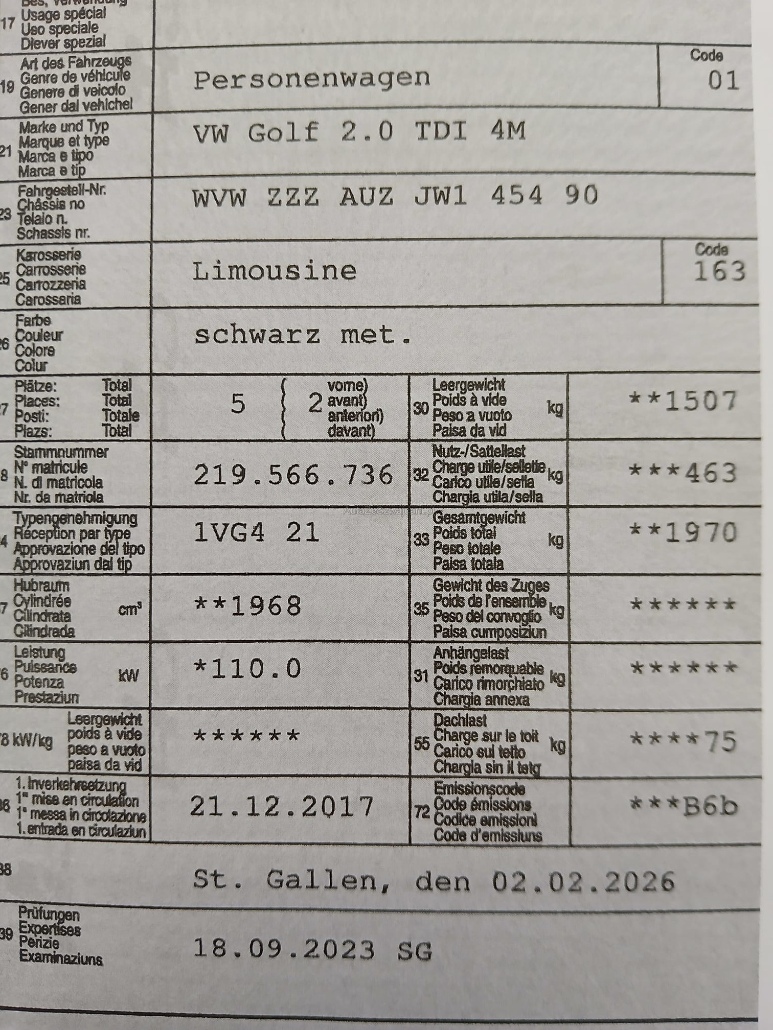 | Kommentar | Technisch nicht geprüft. Fahrzeug läuft und kann gefahren werden. Warnlampen leuchten Keine. Hat 1 Schlüssel und Serviceheft ist nicht komplett. Hat auf dem Dach einen Hagelschaden (siehe Bilder) Auf der Haube nur vereinzelt. Dieselfilter erfolgreich getestet. Hat Winterräder mit sehr gutem Profil und Sommerräder. Zustand von aussen und innen gut. Kleinere Kratzer auf der Carosserie sonst gut. Fahrzeug MUSS innert 7 Tage abgeholt werden. (Banküberweisung) |