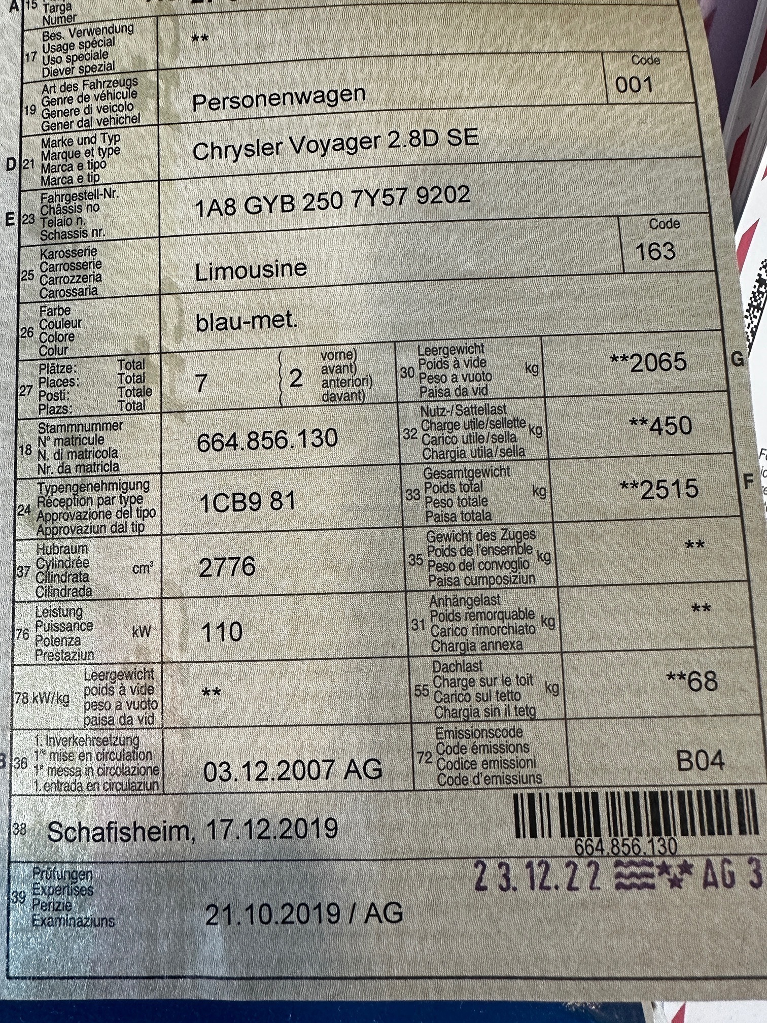 | Kommentar | Fahrzeug mit Heckumbau (Rollstuhl gängig), Es wurde kein Eintauschtest gemacht, Netto wie geboten - Ohne Nachverhandlung, Mindestpreis erwartet: 2500 CHF gemäss Kunde |
