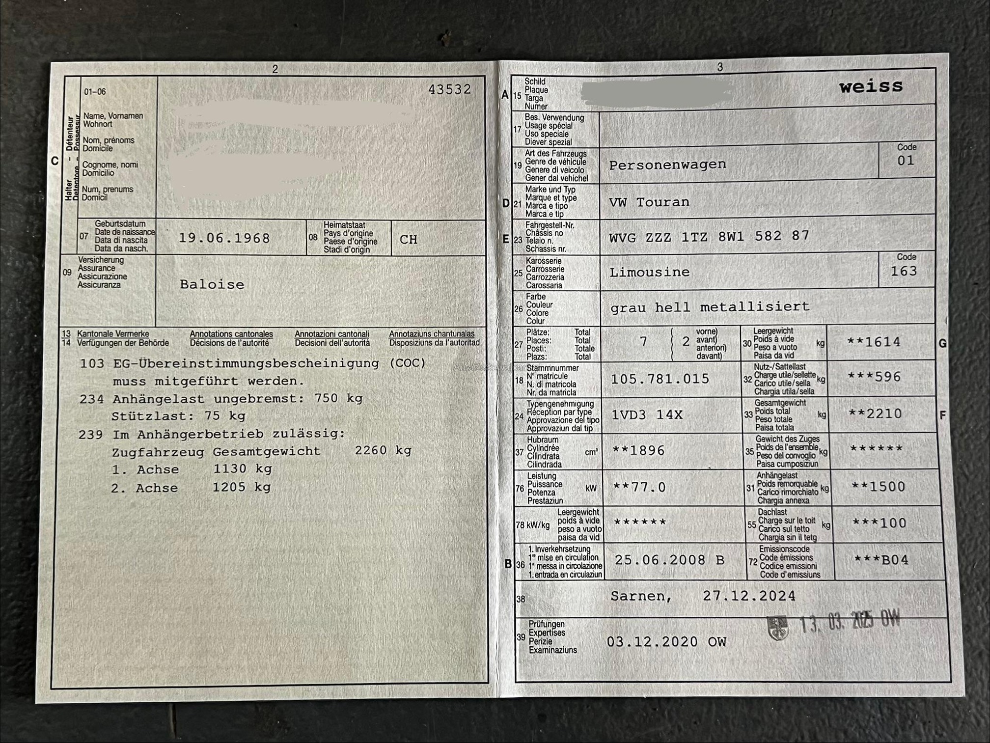 | Kommentar | Auto steht in einem guten technischen Allgemeinzustand da. MFK vor einem Jahr gemacht, seit da nur noch ca. 1000km gefahren. Diverse optische mängel, siehe Fotos. Auto läuft und ist sofort fahrbar. Muss vor Verkauf noch annuliert werden. 7 Sitze!!! Schlüsselfernbedienung geht nicht, aber wahrscheinlich nur Batterie leer. |