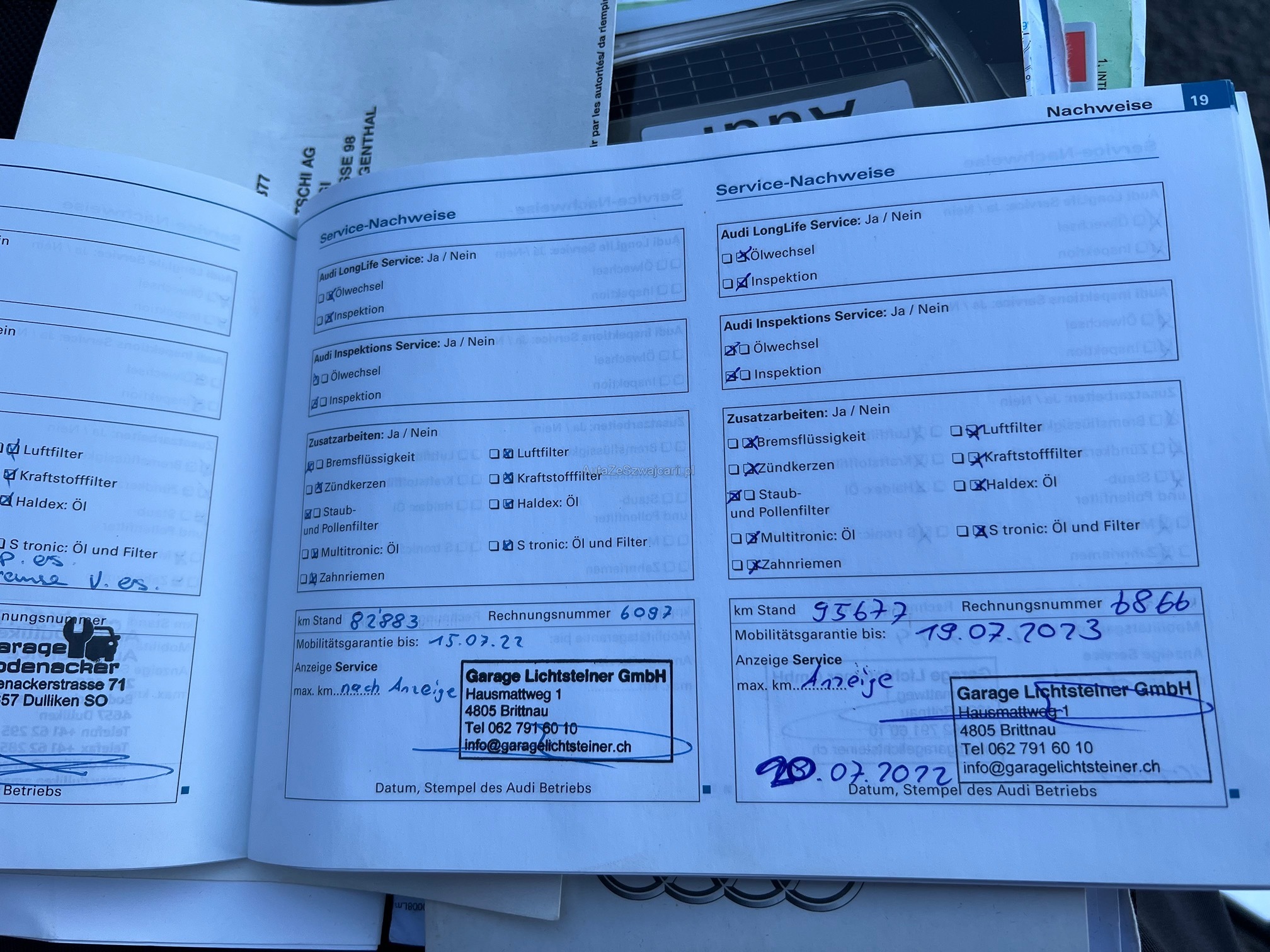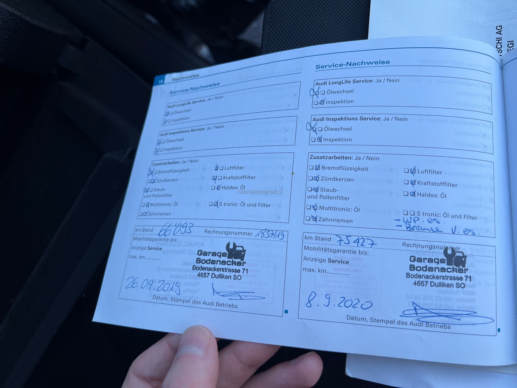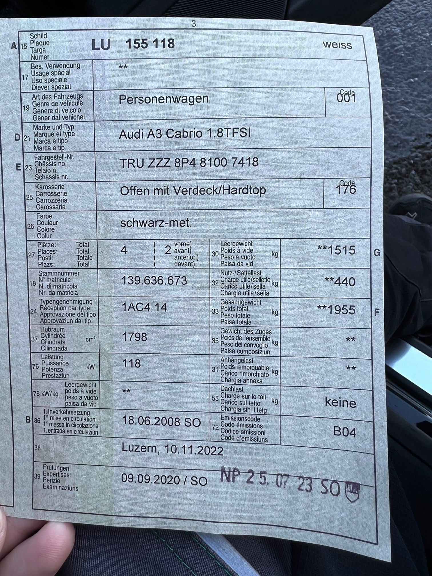 | Kommentar | - Es wurde ein vollständiger Werkstatttest durchgeführt - Probefahrt i.O. (Motor und Fahrwerk) - Probefahrt Getriebe = ruckelt beim Anfahren, ansonsten bei Fahrt i.O. - Carrosserieschäden gemäss Bilder - Frontscheibe hat kleine Steinschläge jedoch OHNE Rissbildung - Service fällig - Verriegelung Mittelarmlehne defekt - Spiegelkappen Aussenspeigel beidseitig angefahren - Klimaanlage gefüllt, jedoch Hochdruckschalter defekt - Leichter Ölverlust an Ladeluftschlauch HR oben, kann gereinigt werden für MFK - Heckklappendämpfer schwach, jedoch noch funktionstüchtig |