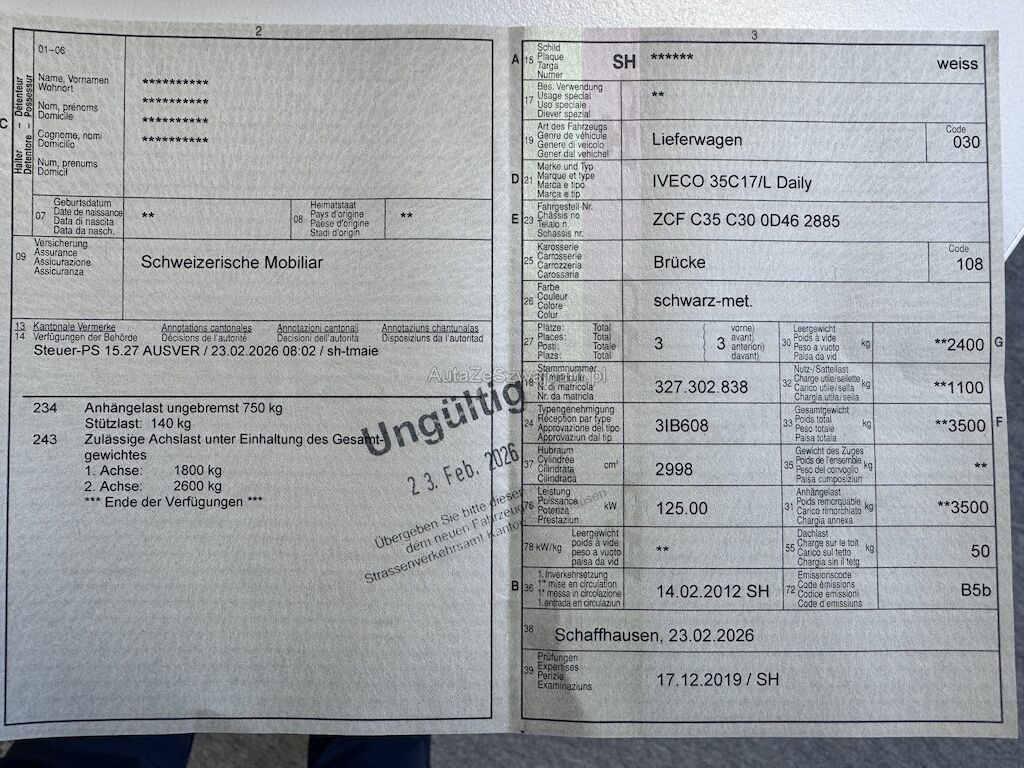 | Bereifung | Fahrzeug läuft, Carrosserie komplett verbeult und verkratzt. innen sehr schmutzig. Fahrzeug ist beschriftet.Nutzlast 1'100kg, Anhängerlast 3'500kg, für EXPORT |