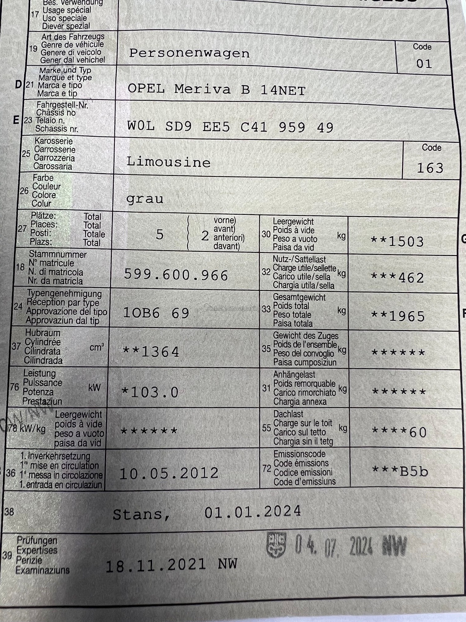 | Kommentar | Winterräder 2x 5mm / 2x 7mm Bekannte Mängel: - Wärmetauscher muss bald gemacht werden - Getriebe hörbar im 3. und 4. Gang - 1 Schlüssel hat defekte Knöpfe - optische Gebrauchsspuren gemäss Bilder ab Platz ohne Garantie Fahrzeug muss nach Ersteigerung innert 7 Tagen abgeholt werden |