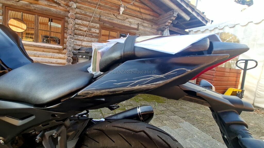 Heckverschalung zerkratzt, Seitenschale vorne oben und unten zerkratzt, Fussraster VL + HL zerkratzt + verbogen, Schwinger HL zerkratzt, Schalthebel verbogen, Seitenständer, Spiegel links, Lenker VL, Lenkergewicht VL, Kupplungshebel, Lenkeranschlag VL, Heckleuchten- + Nummerträger gebrochen