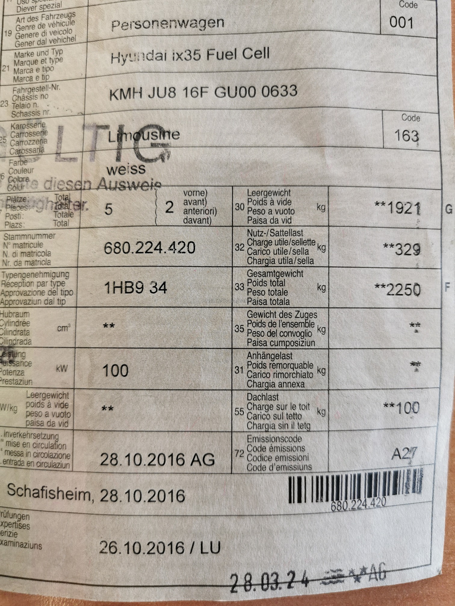 | Kommentar | Brennstoffzelle ist defekt, Starterbatterie defekt Fahrzeug muss aufgeladen werden und fährt nicht mehr. Schäden gemäss Fotos, weitere Schäden sind nicht ausgeschlossen (Fahrzeug war schmutzig). Jede Gewährleistung wird wegbedungen, insbesondere sind Wandlung und Minderung ausgeschlossen. Eine Garantie wird nicht gewährt. |