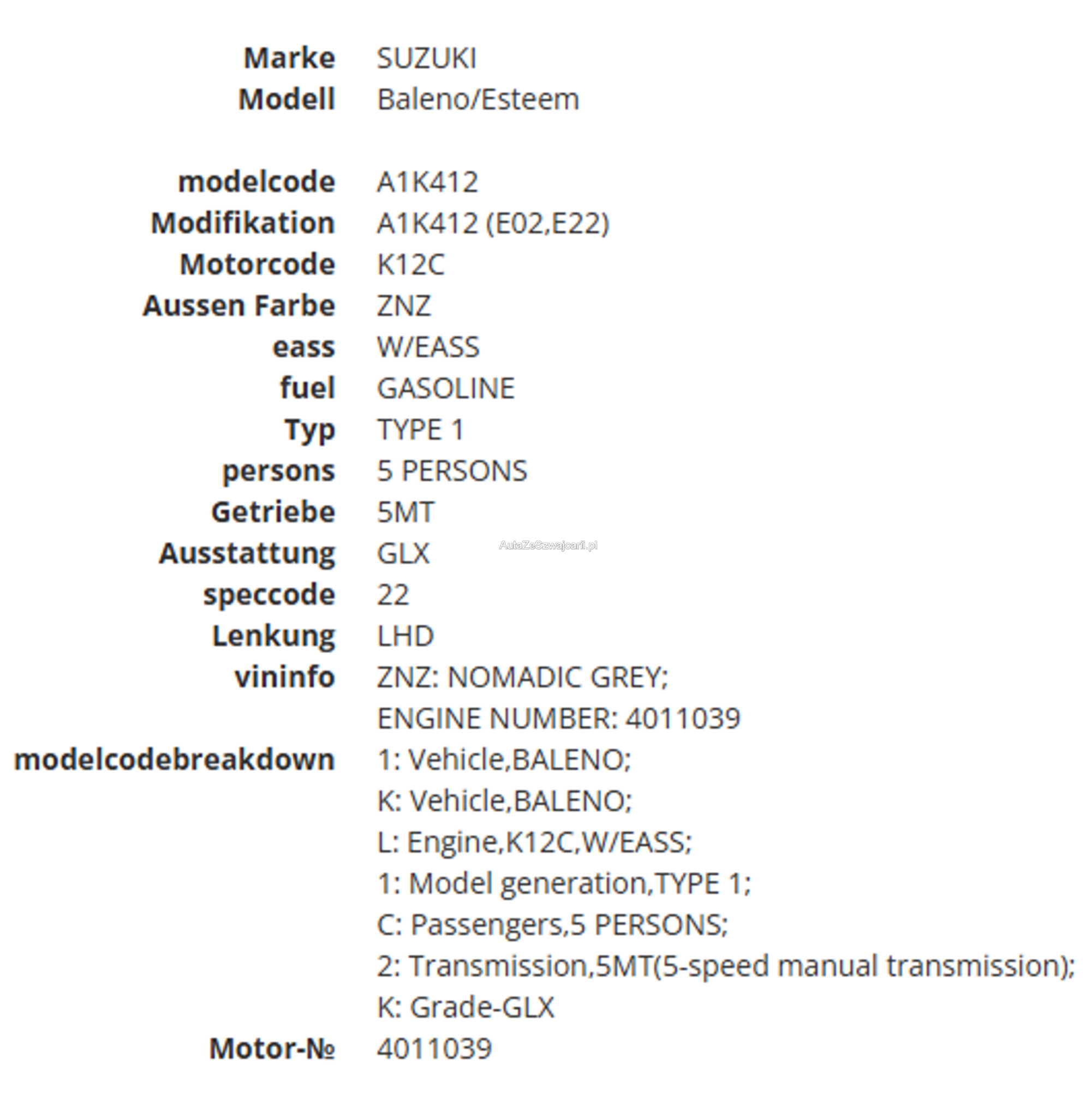 | Kommentar | + Gepflegter SUSZUKI Baleno aus zweiter Hand + Top Ausstattung + 8 fach Alu + Servicegepflegt + mit wenig Aufwand MFK bereit + keine Mängel bekannt + wurde jedoch nicht von uns geprüft |