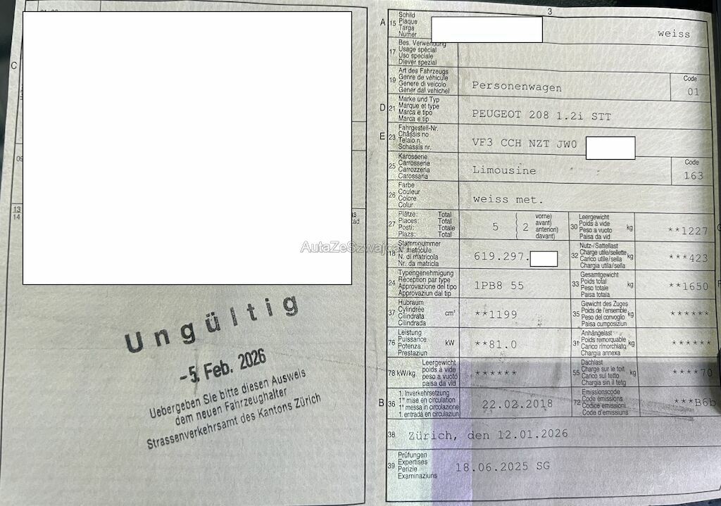 | Information | Der Kilometerstand wurde abgelesen. Gebrauchsspuren und kleinere Vorschäden sind möglich. Am Fahrzeug sind Winterräder montiert, keine weitere Bereifung vorhanden. Vor Ort waren: 1 Schlüssel, Ausweis, Borddokumente. Motor und Getriebe wurde nicht geprüft Weitere nicht aufgeführte oder verdeckte Schäden sind möglich! |